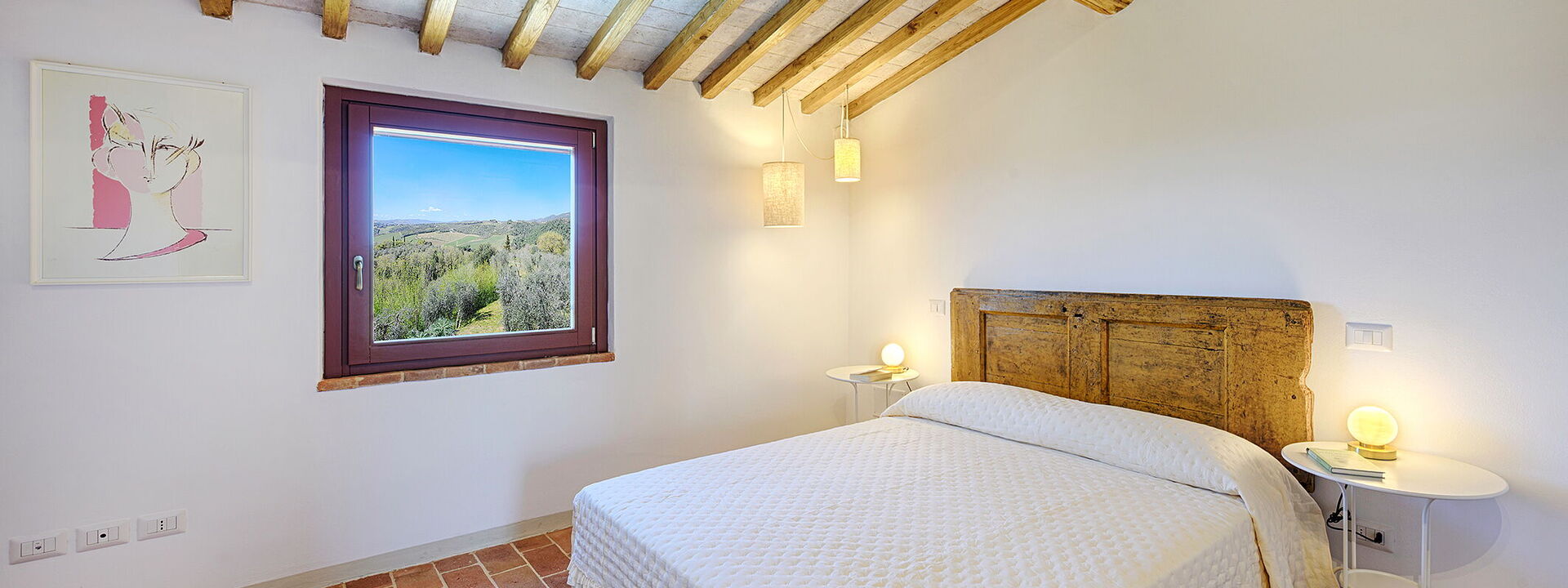 Al piano superiore una camera matrimoniale con un bowindow sulla vallata.