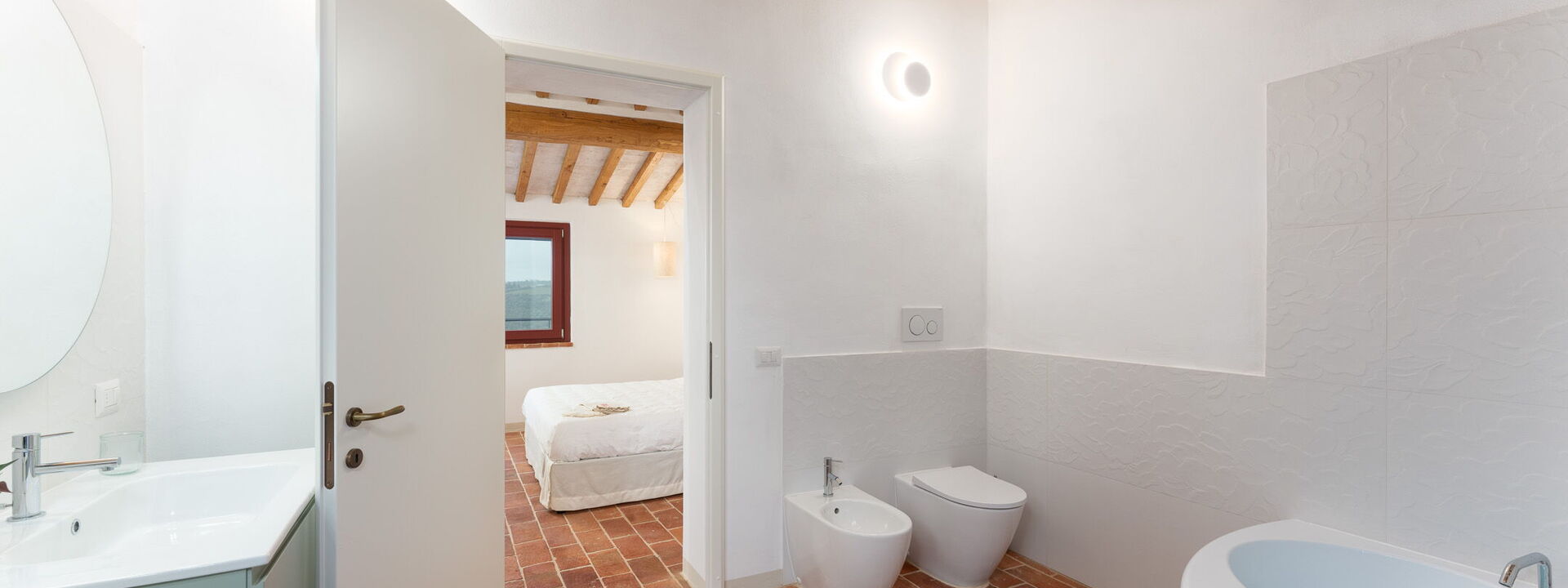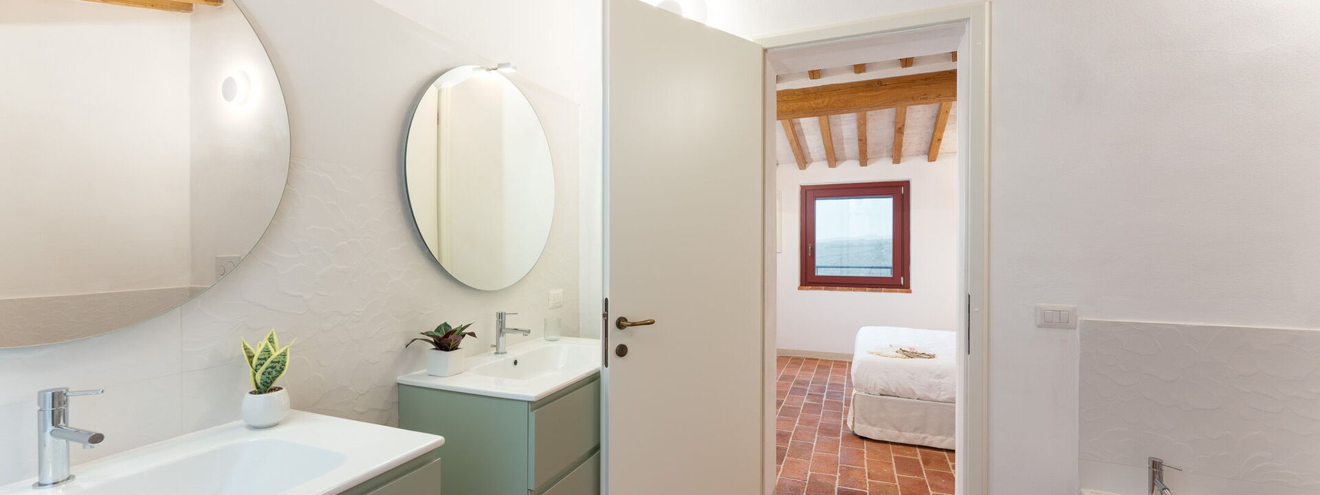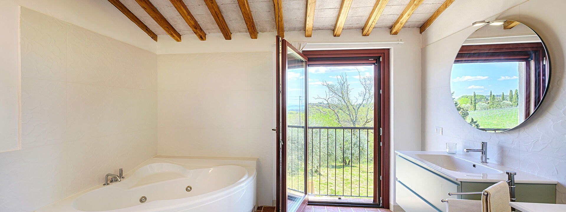 Dalla zona di ingresso si sale al piano superiore, dove ci sono altre 2 camere matrimoniali con bagno in camera. Tutti e due i bagni hanno un'ampia vasca, una delle quali idromassaggio.
