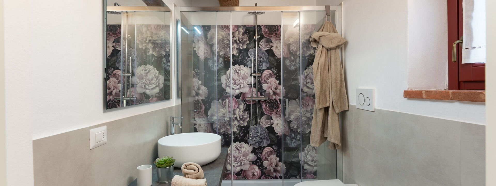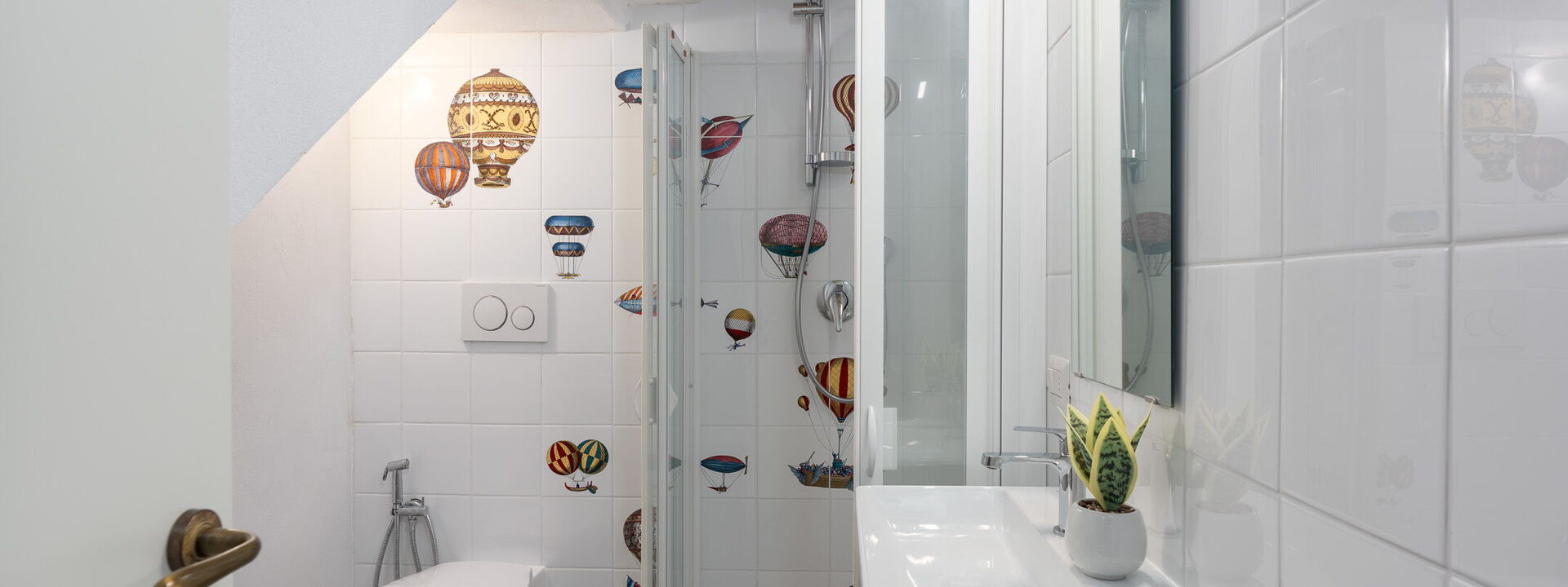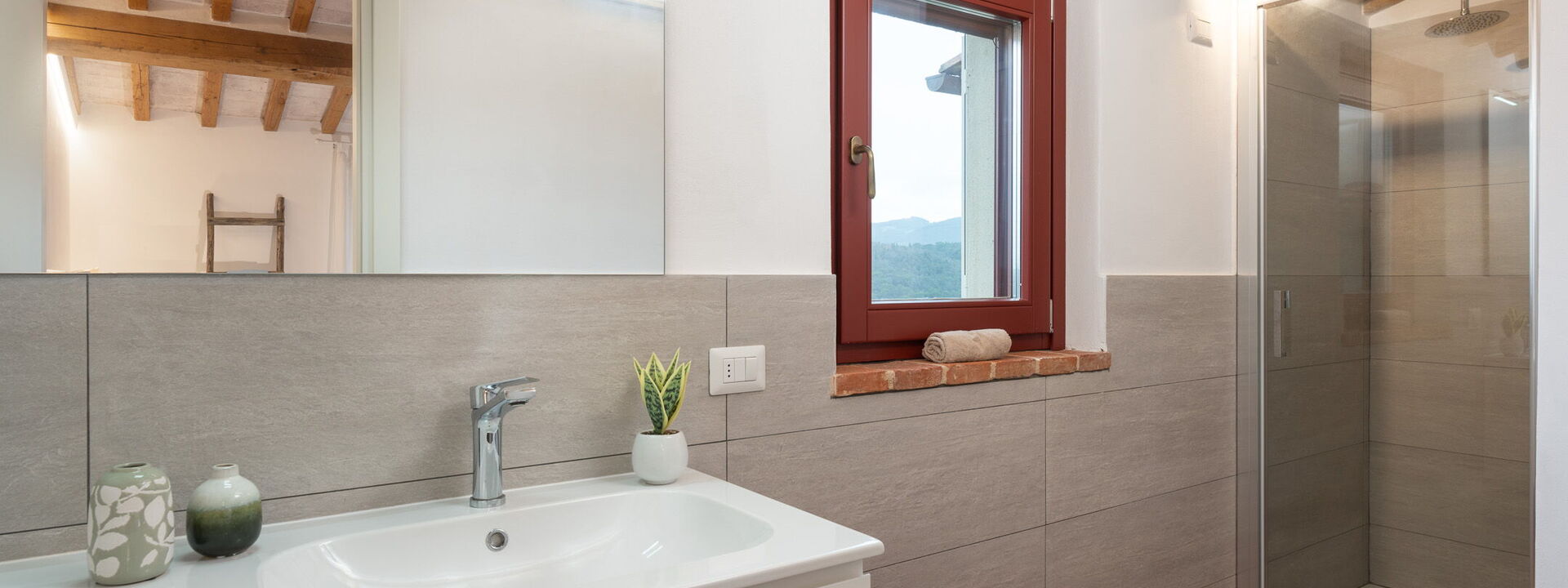 Il bagno è realizzato in ceramiche decorate, completo di doccia e finestra panoramica.