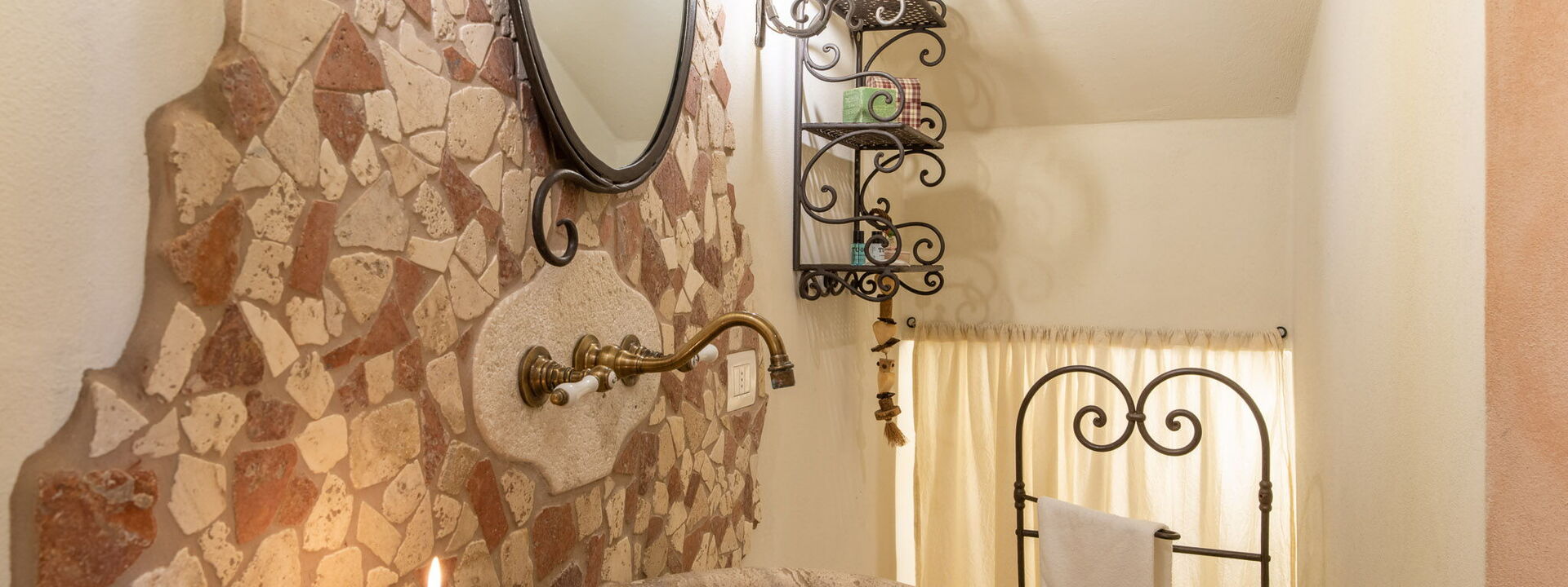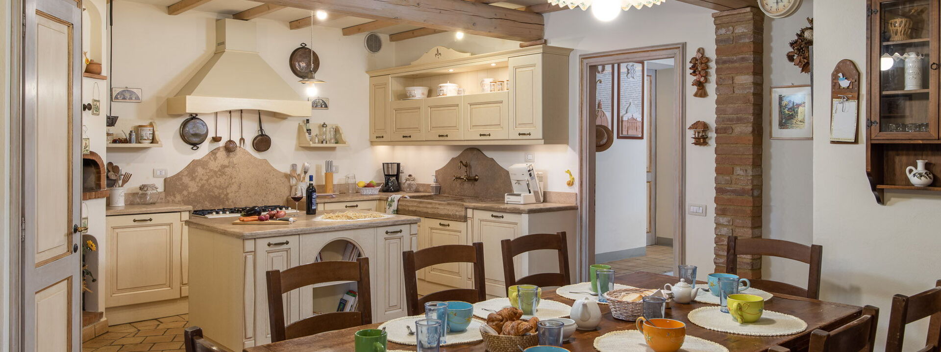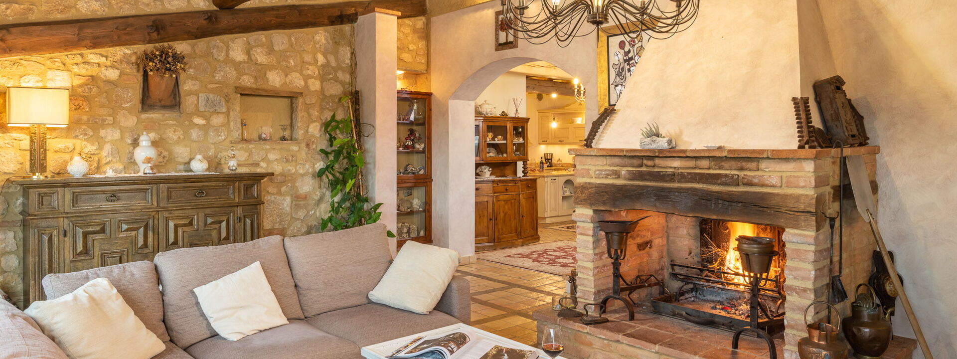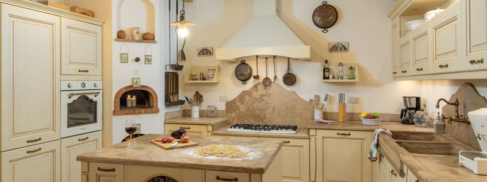 Il livello d'ingresso ospita una cucina da sogno: dotata di una massiccia isola centrale, finiture in pietra locale e un tradizionale forno a legna. È completata da frigorifero, freezer, forno elettrico, microonde, tostapane, bollitore, macchina del caffè Lavazza "A Modo Mio" e moka.