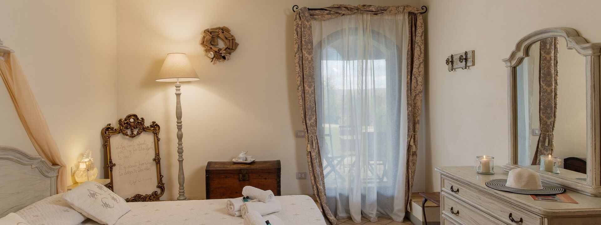 Garden Suite: Una magnifica suite con letto King-size e bagno privato, caratterizzata da una grande porta ad arco in vetro che si apre direttamente sul prato.
