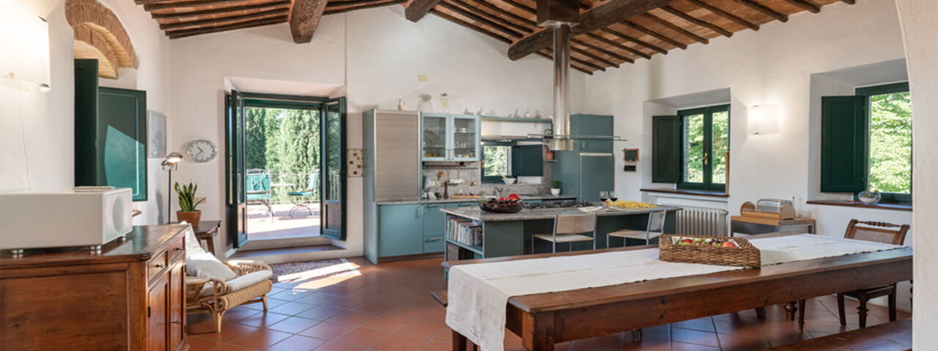 Ampia zona giorno con sala da pranzo e cucina attrezzata, accesso diretto a una grande terrazza panoramica, perfetta per cene all'aperto con vista sul bosco circostante.