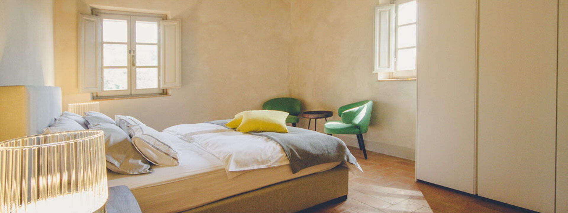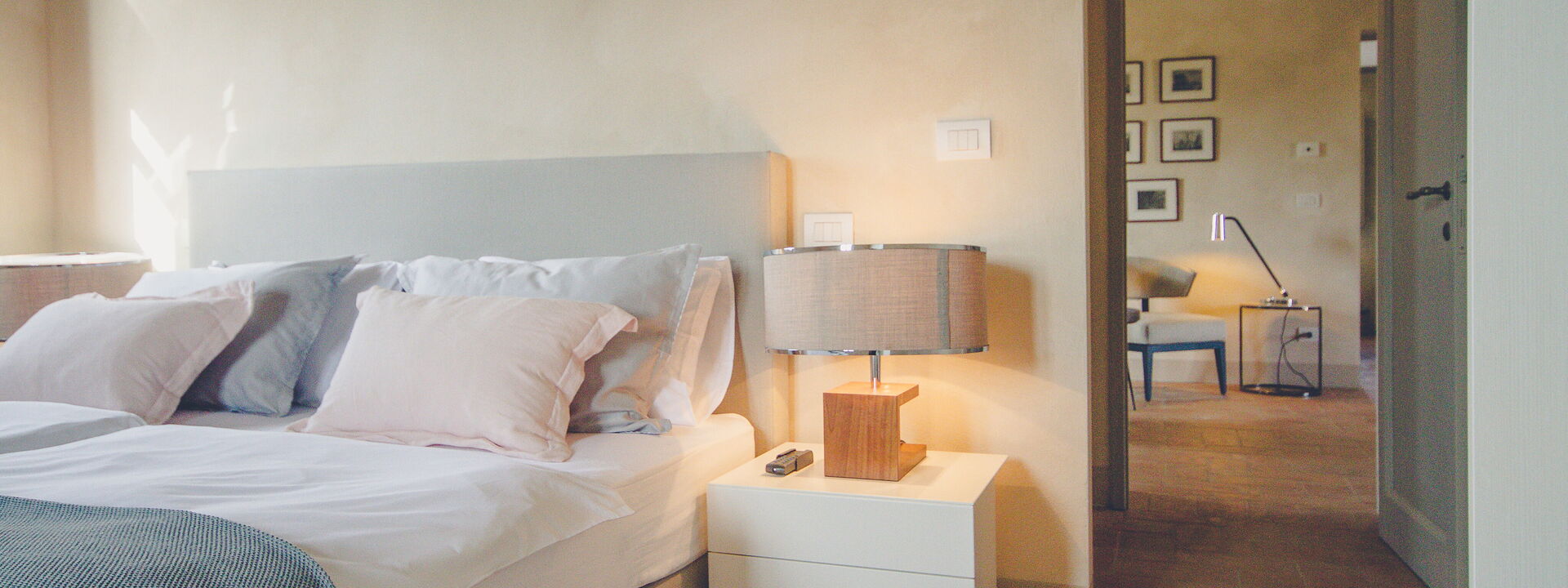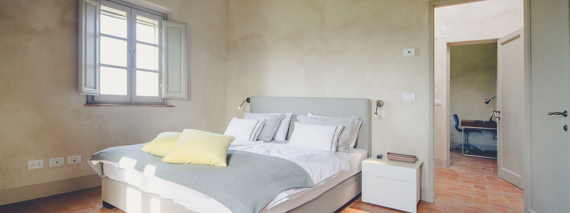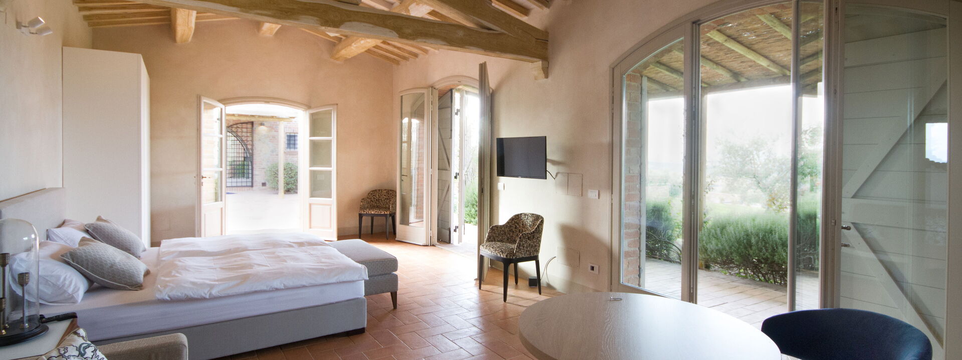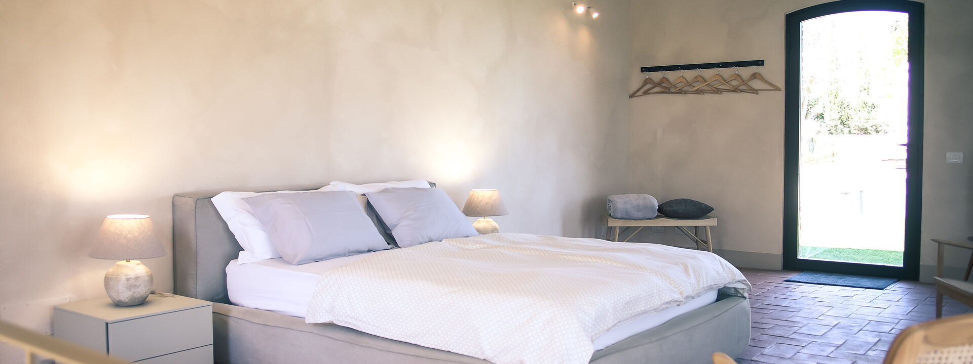 Due Junior Suites, situate al secondo piano della villa, offrono ciascuna 20 m² di comfort raffinato. Le suite dispongono di un letto king-size (180 x 200 cm) con biancheria di alta qualità, creando il rifugio perfetto per il relax, con ampi armadi in legno, eleganti lampade da comodino, aria condizionata e ventilatore a soffitto per un comfort aggiuntivo. Le finestre sono dotate di persiane e zanzariere per garantire un soggiorno tranquillo. I bagni privati sono arricchiti con pietre naturali toscane e marmo, aggiungendo un tocco di eleganza rustica, e includono una spaziosa doccia e un set di vanità di lusso.