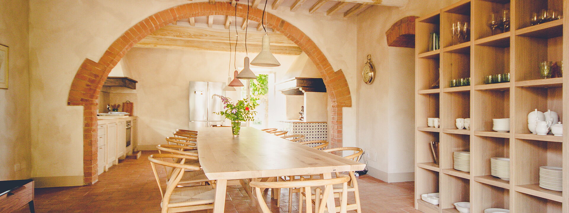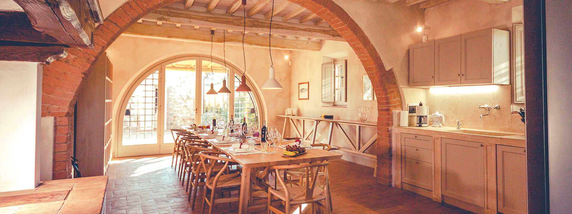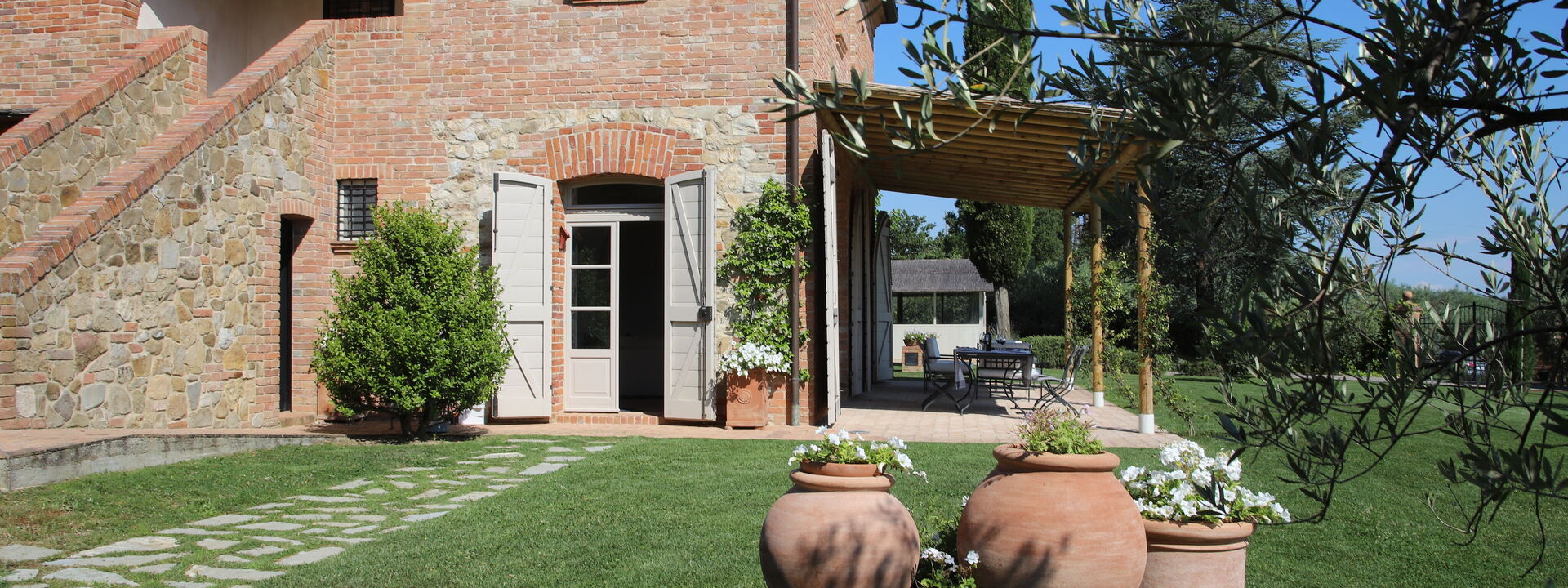 Questo splendido patio esterno è il luogo ideale per gustare pranzi all'aperto, immersi nel tranquillo paesaggio della campagna toscana. Coperto da una rustica pergola adornata di verde rampicante, lo spazio ospita un ampio tavolo da pranzo che può comodamente accogliere 14 persone, perfetto per cene in famiglia o con amici. Il patio si affaccia sulle eleganti porte ad arco della villa, creando una naturale continuità tra gli spazi interni e l'ampio spazio esterno. Che stiate gustando una caffè mattutino, sorseggiando un bicchiere di vino o riunendovi per una cena serale, questo patio da pranzo vi invita a rilassarvi e a godere appieno della bellezza della Toscana.