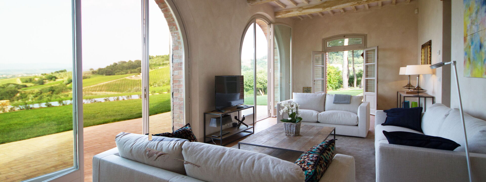 Il soggiorno offre una vista panoramica mozzafiato sulle dolci colline delle vigne e sul bellissimo paesaggio toscano attraverso le sue ampie finestre ad arco che vanno dal pavimento al soffitto. Lo spazio è elegantemente progettato con arredi moderni e confortevoli che invitano al relax. Per il vostro intrattenimento, il soggiorno è dotato di una TV a schermo piatto con accesso a Netflix, ideale per rilassarsi dopo una giornata di esplorazione.
