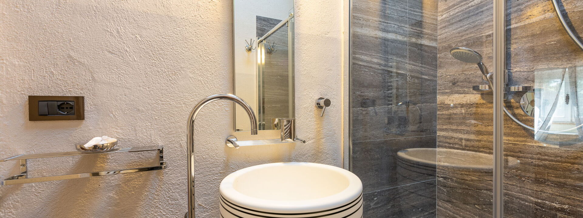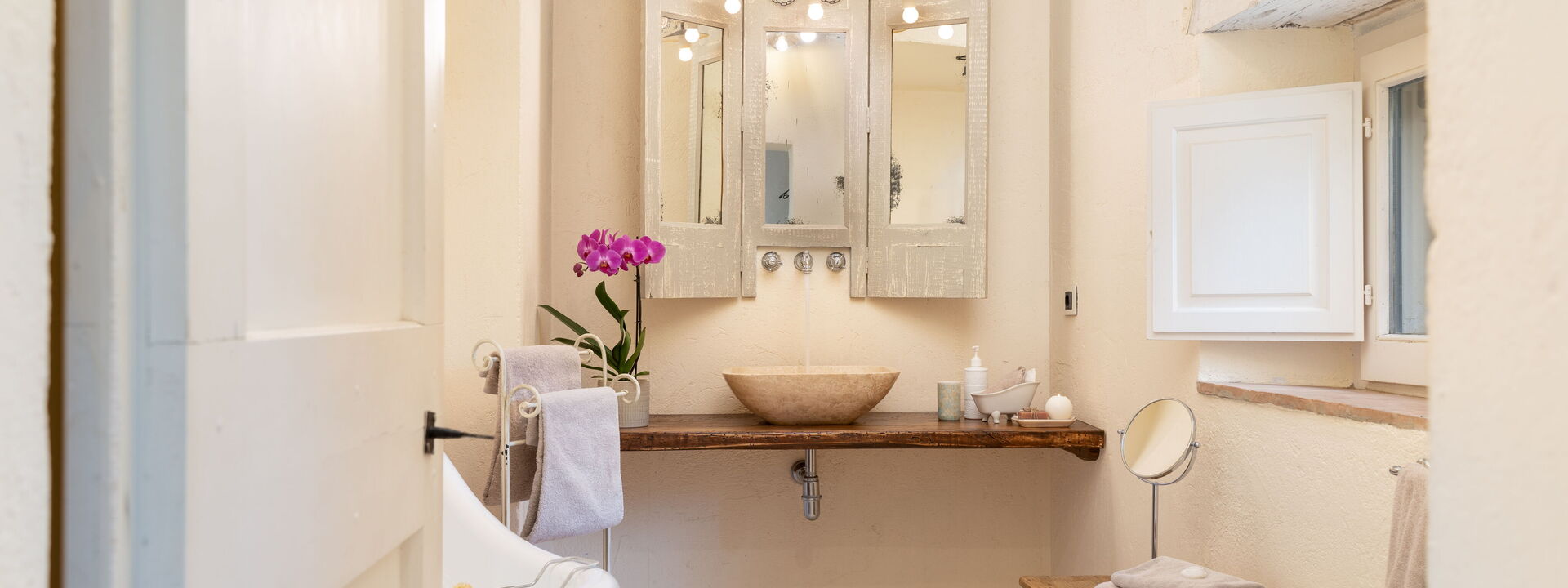 materiali: bagni in travertino italiano e rubinetteria di design italiano, biancheria da letto e tende in abiti italiani, materassi memory e mobili di alto design italiano.