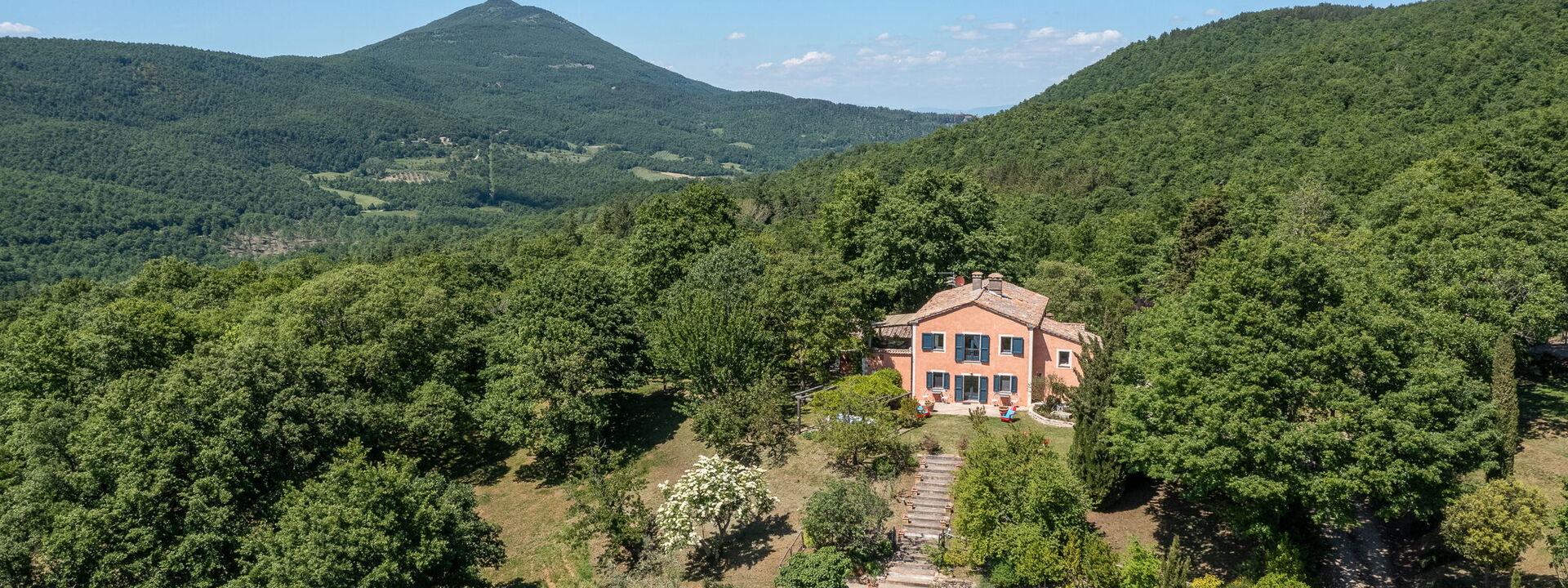 Un'ampia scala in mattoni di cotto fatto a mano conduce al piano superiore che si apre sul soggiorno con camino e sul terrazzo coperto con vista sul giardino e sul bosco,