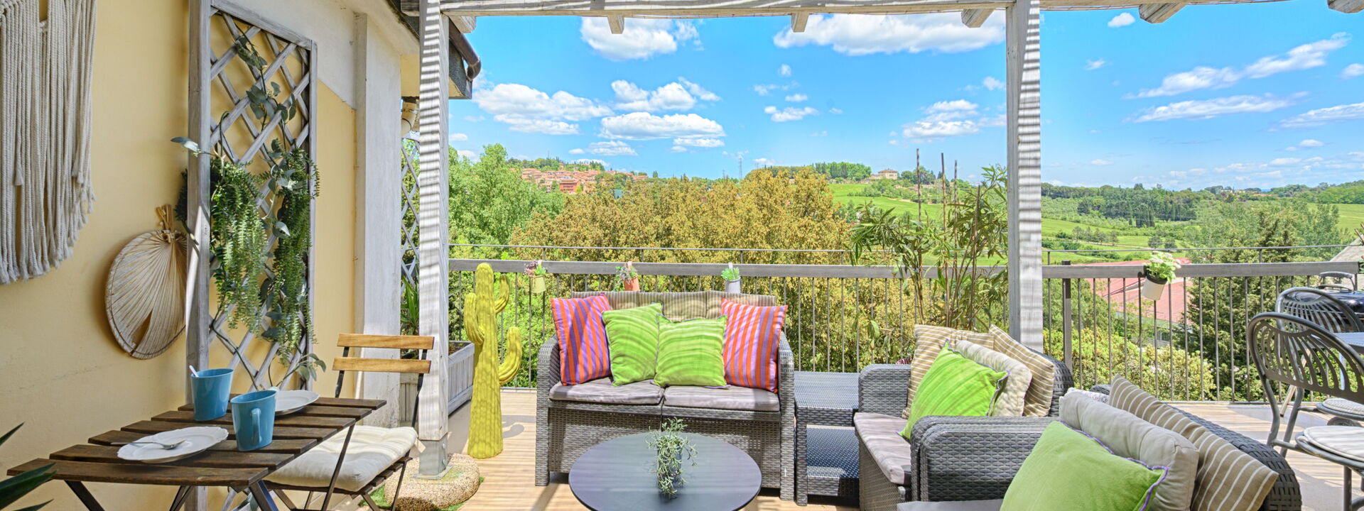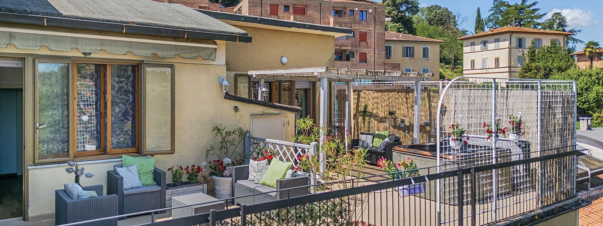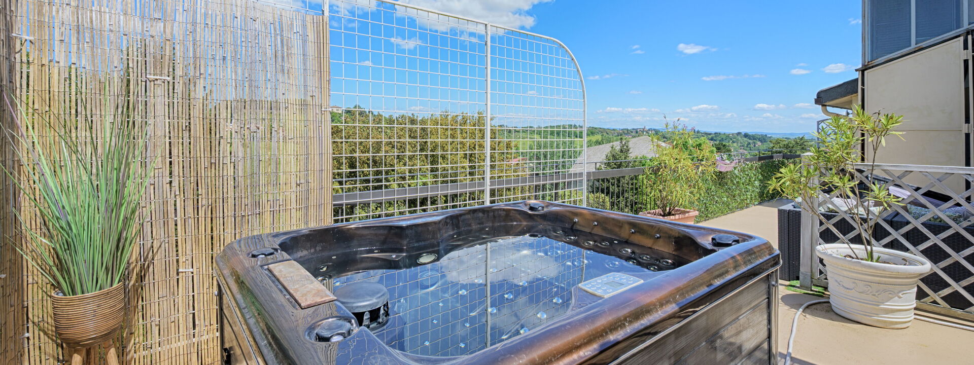 Gli spazi esterni si estendono su 80 mq di terrazze panoramiche con idromassaggio privato, doppi gazebo e barbecue— il luogo ideale per rilassarsi dopo una giornata alla scoperta di Siena e delle meraviglie della Toscana.