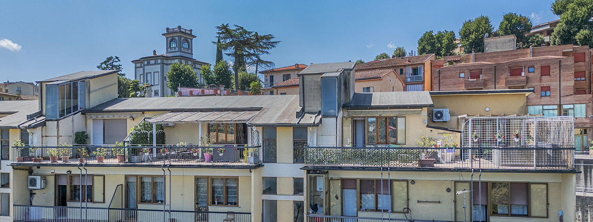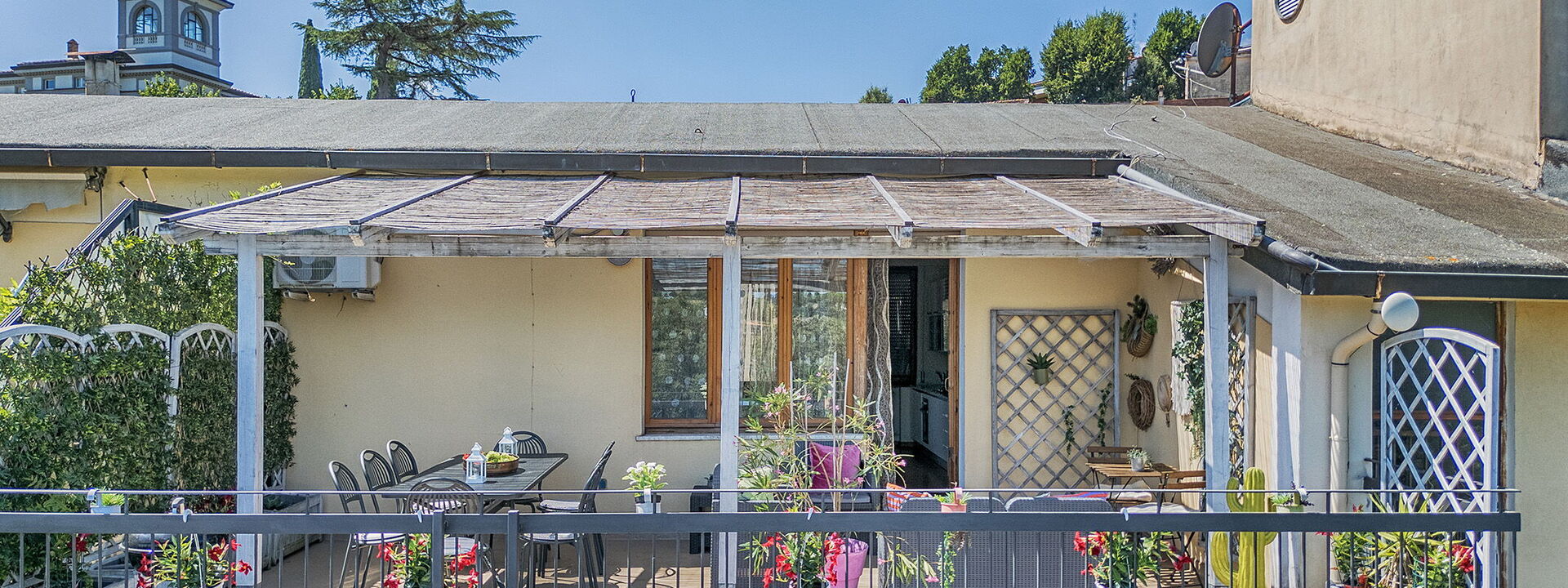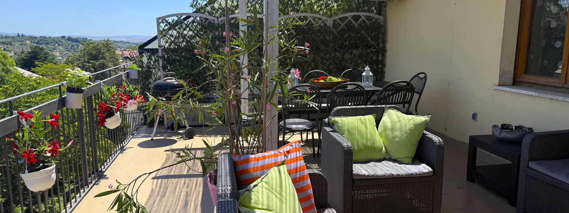 Gli spazi esterni si estendono su 80 mq di terrazze panoramiche con idromassaggio privato, doppi gazebo e barbecue— il luogo ideale per rilassarsi dopo una giornata alla scoperta di Siena e delle meraviglie della Toscana.