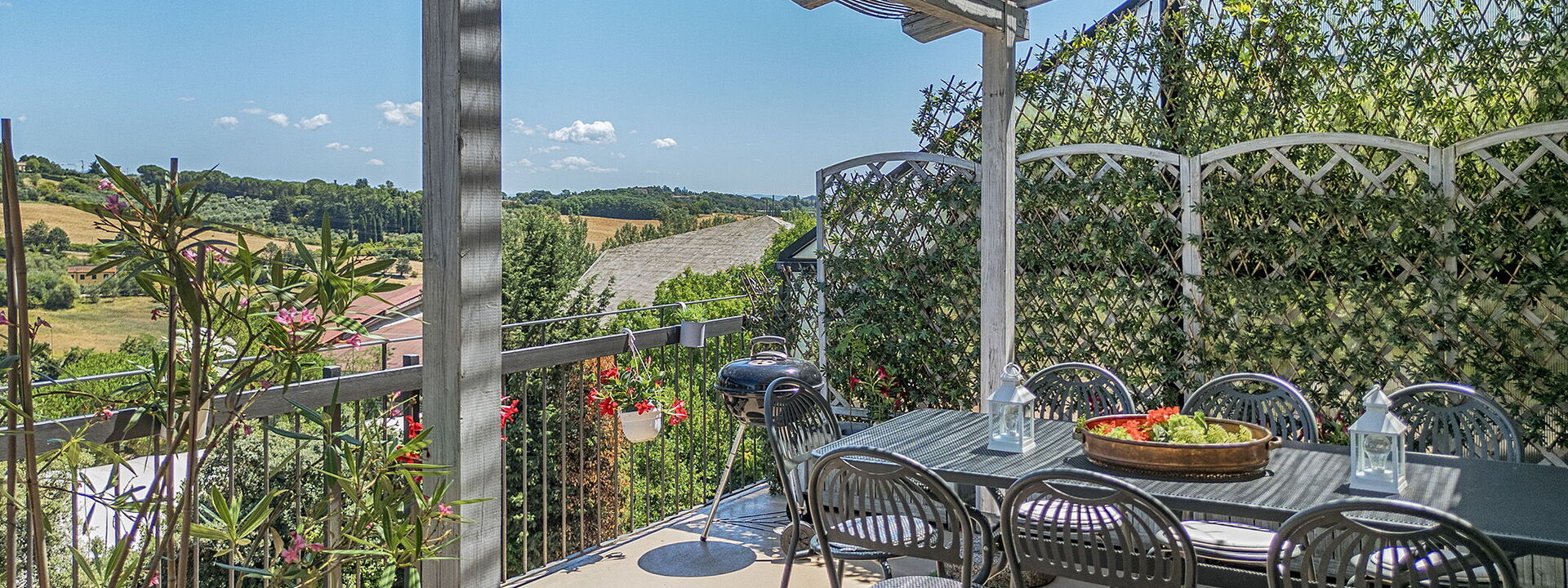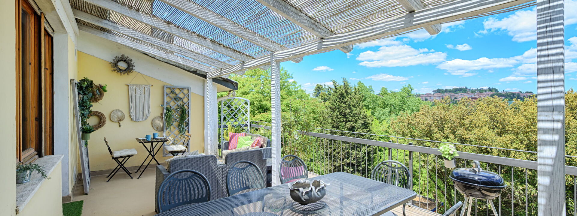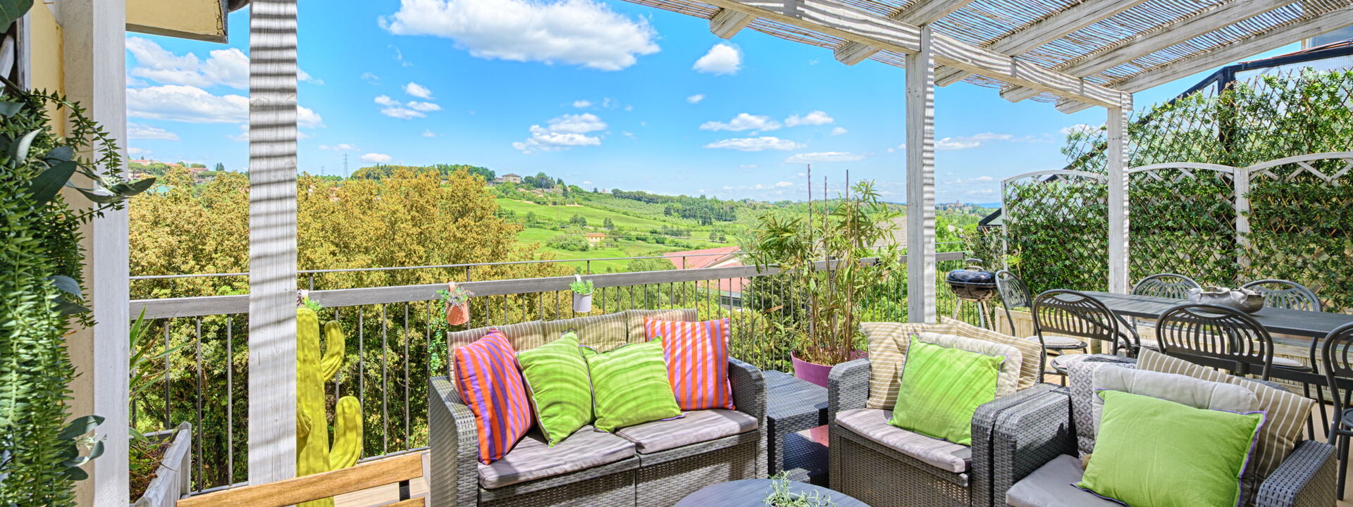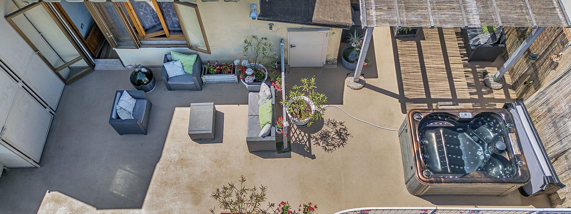 L'attico si trova al quarto piano dell'edificio (servito di ascensore) e offre ampi spazi interni insieme a due terrazze panoramiche private che si affacciano sulla campagna. La prima terrazza è pensata per le cene all'aperto, attrezzata con gazebo e barbecue professionale. La seconda terrazza invece è dedicata al relax, con una vasca idromassaggio privata, lettini prendisole e un'area lounge ombreggiata.