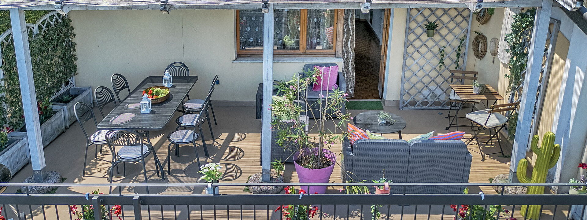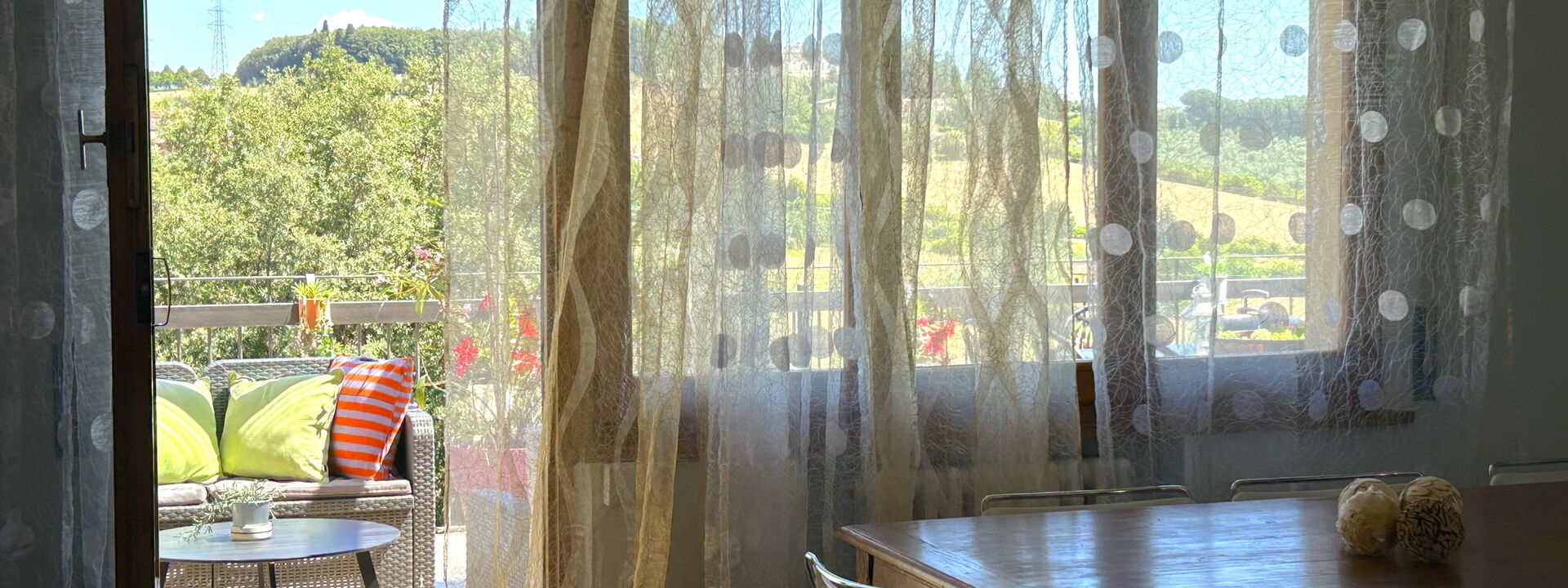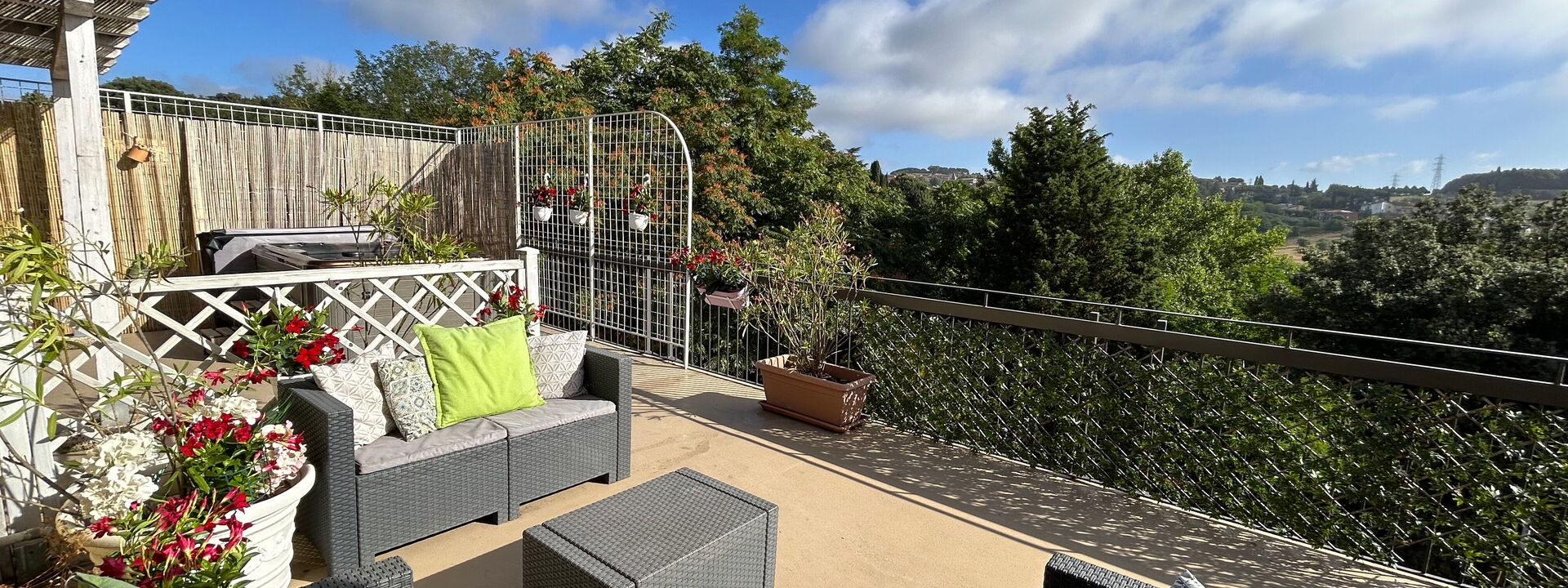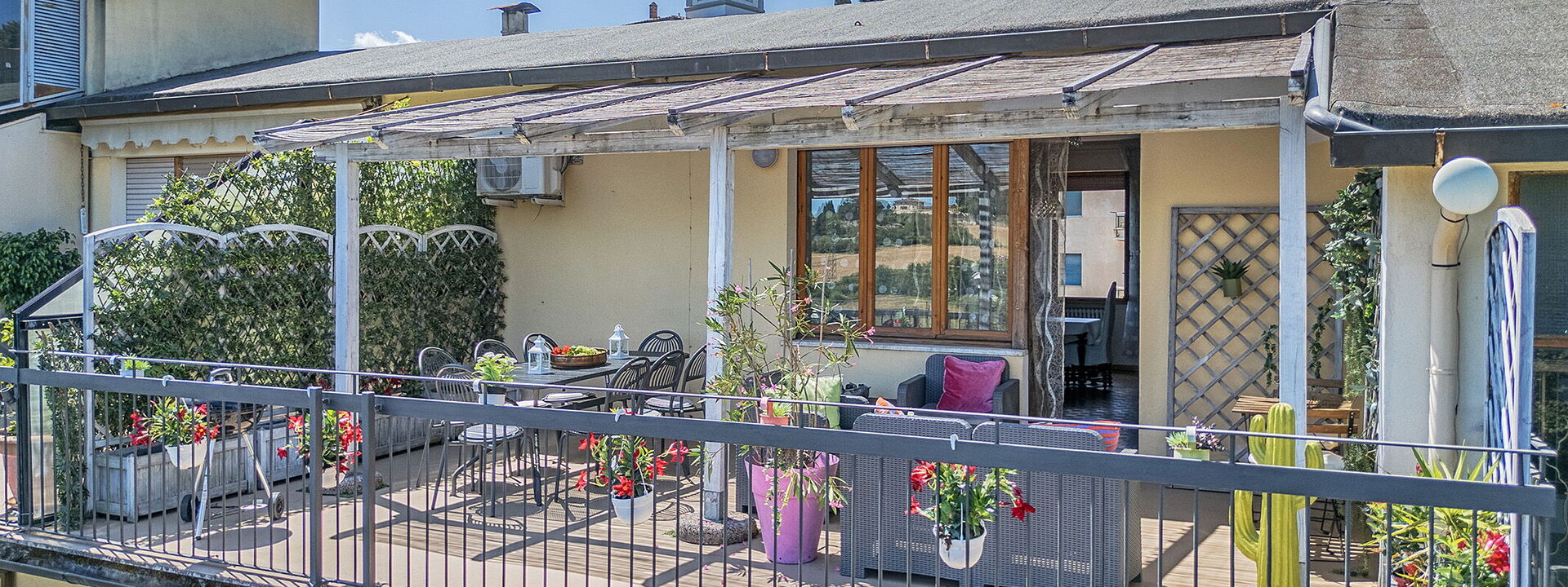 L'attico si trova al quarto piano dell'edificio (servito di ascensore) e offre ampi spazi interni insieme a due terrazze panoramiche private che si affacciano sulla campagna. La prima terrazza è pensata per le cene all'aperto, attrezzata con gazebo e barbecue professionale. La seconda terrazza invece è dedicata al relax, con una vasca idromassaggio privata, lettini prendisole e un'area lounge ombreggiata.