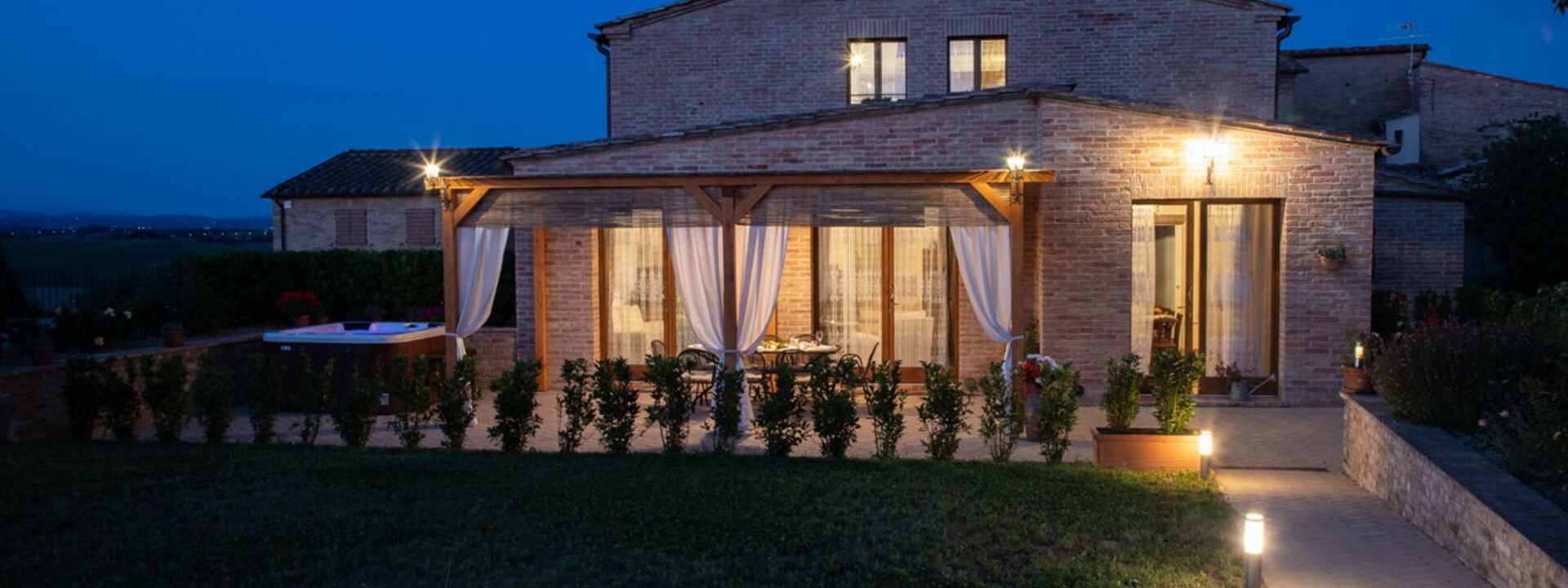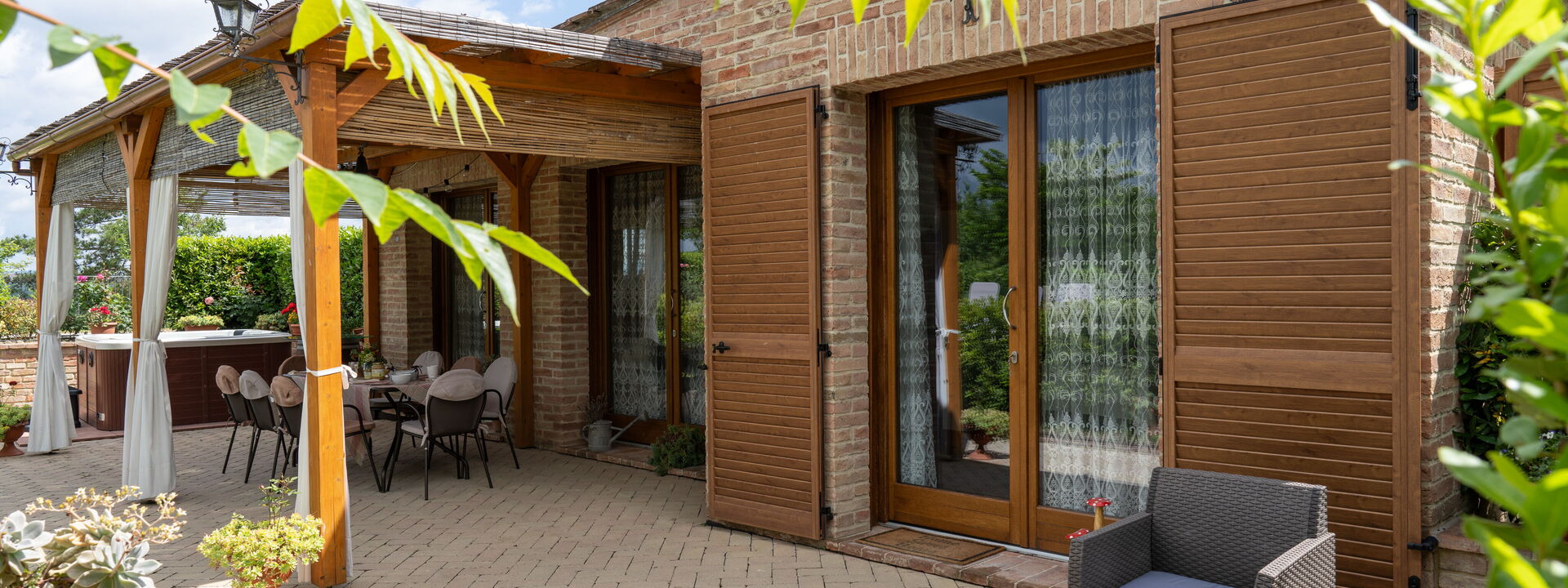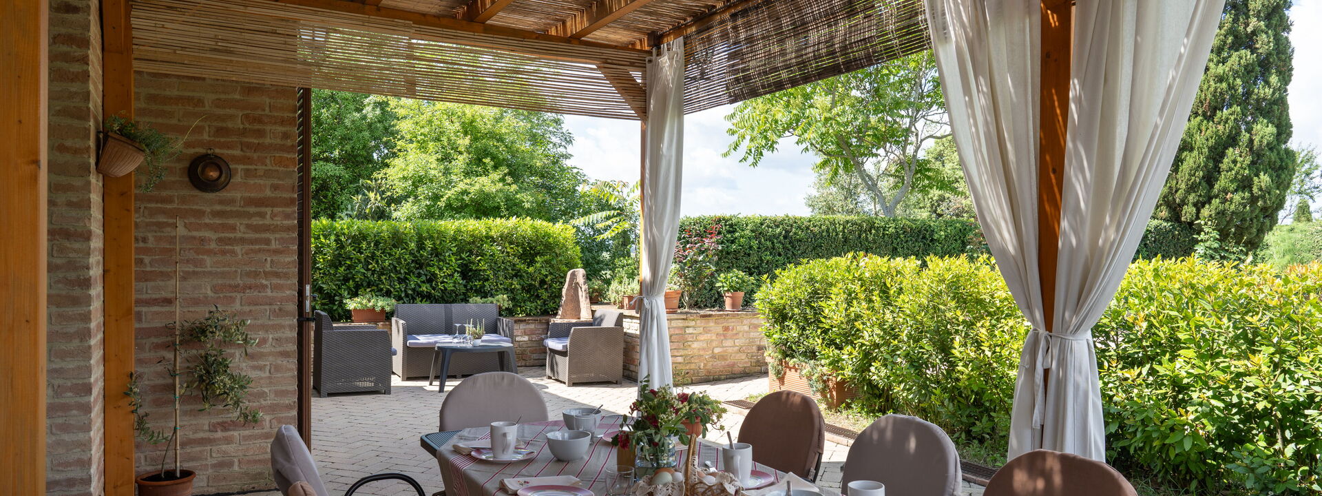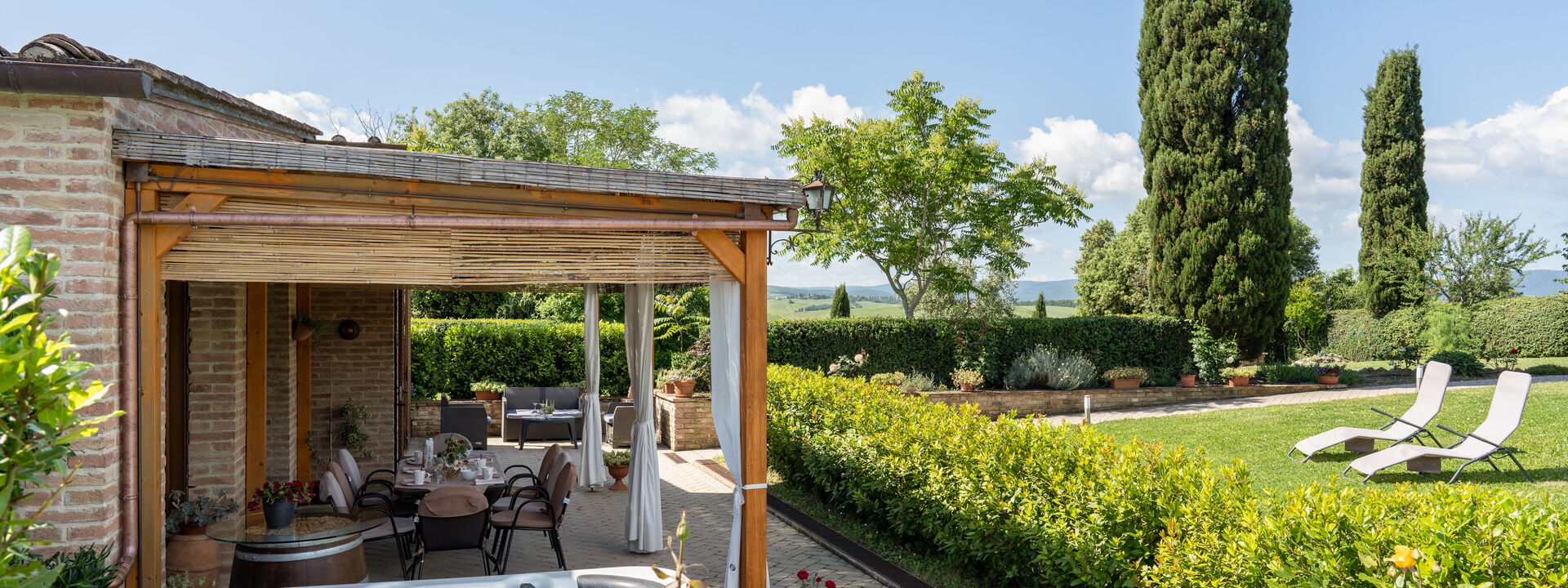 All'esterno, gli ospiti possono godersi il giardino privato e la pergola coperta, il luogo perfetto per cene all'aperto e per rilassarsi all'aria fresca della campagna.