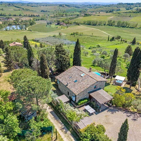 Al piano terra, un ampio soggiorno con camino offre uno spazio rilassante per ritrovarsi, mentre l'elegante sala da pranzo e la cucina completamente attrezzata si aprono direttamente sull'area pranzo esterna. Da qui, gli ospiti possono passare agevolmente dagli spazi interni a quelli all'aperto, godendosi i pasti sotto il cielo della Toscana.