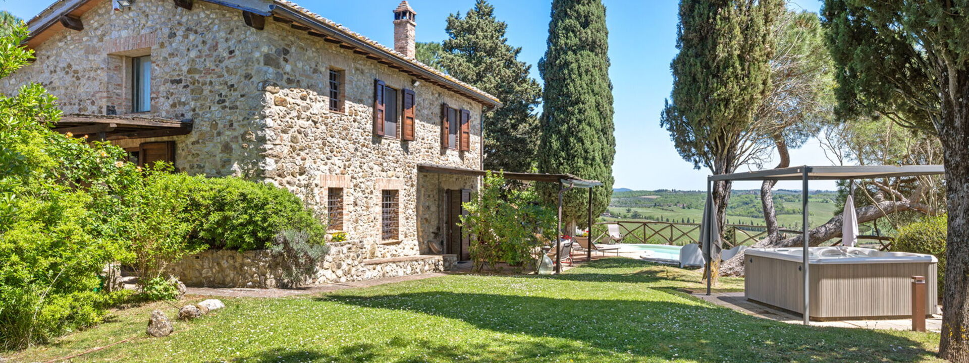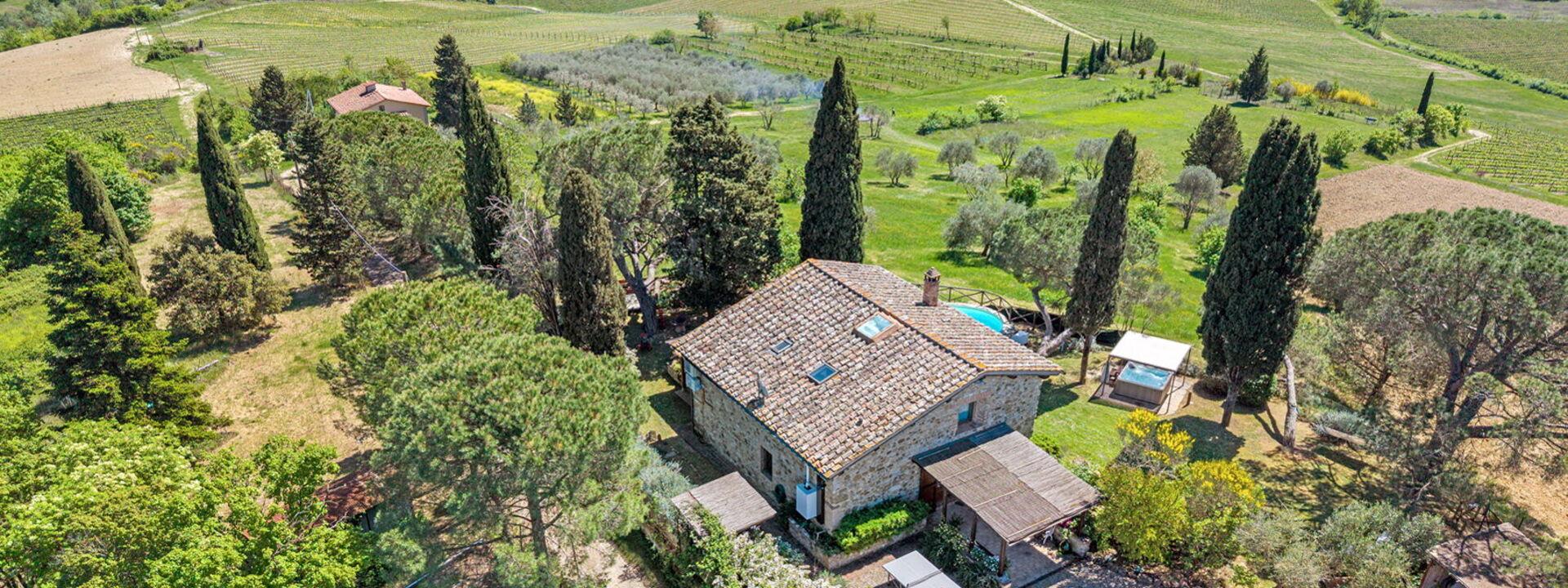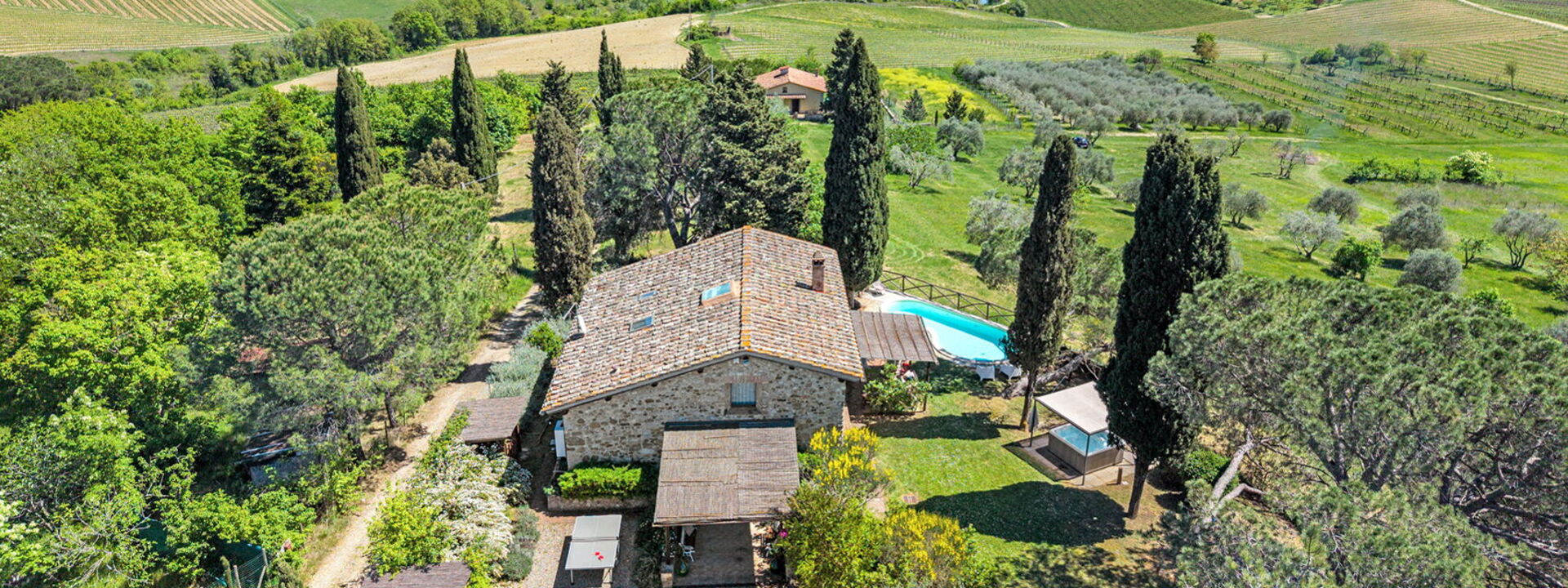 Le spesse mura in pietra della casa garantiscono un ambiente naturalmente fresco, mentre il moderno sistema di aria condizionata presente in tutta la villa assicura un comfort ottimale anche nei mesi più caldi. Al mattino presto, la valle sottostante si riempie spesso di una nebbia leggera che sale tra le colline: uno spettacolo di rara bellezza da ammirare direttamente dal giardino o dalle finestre della villa.