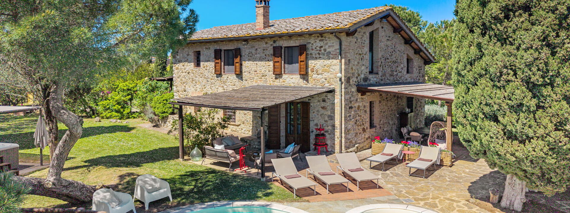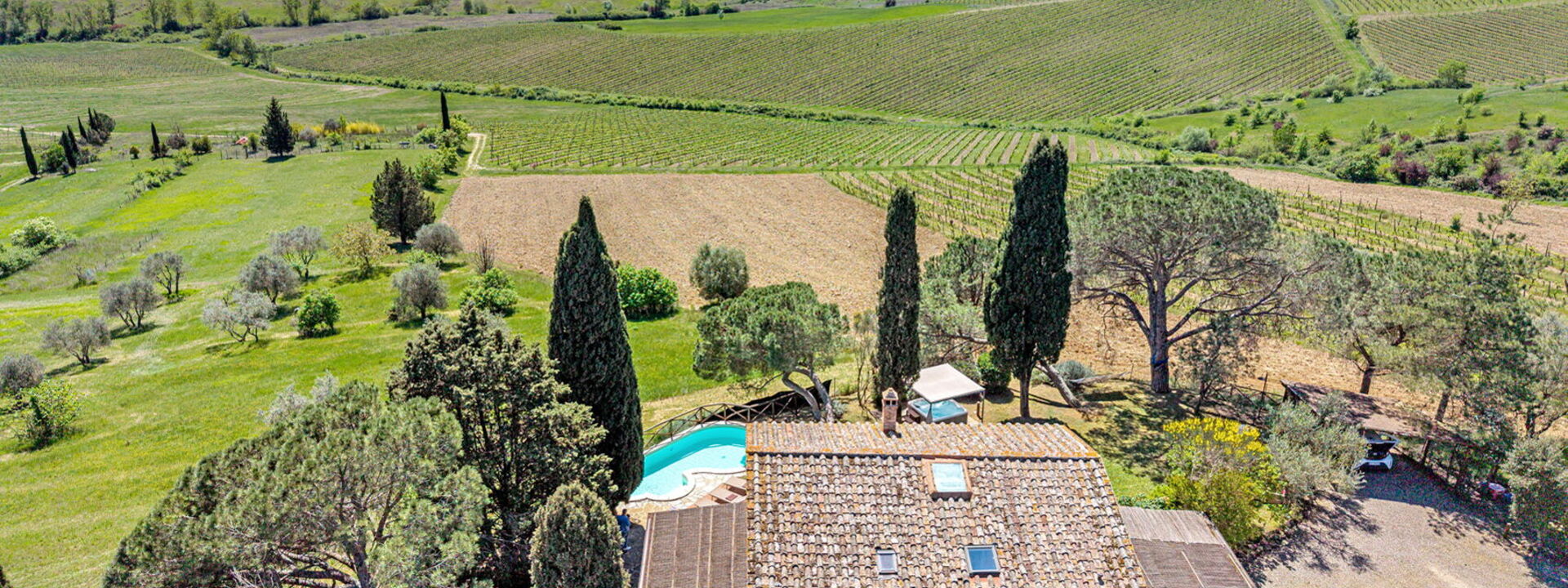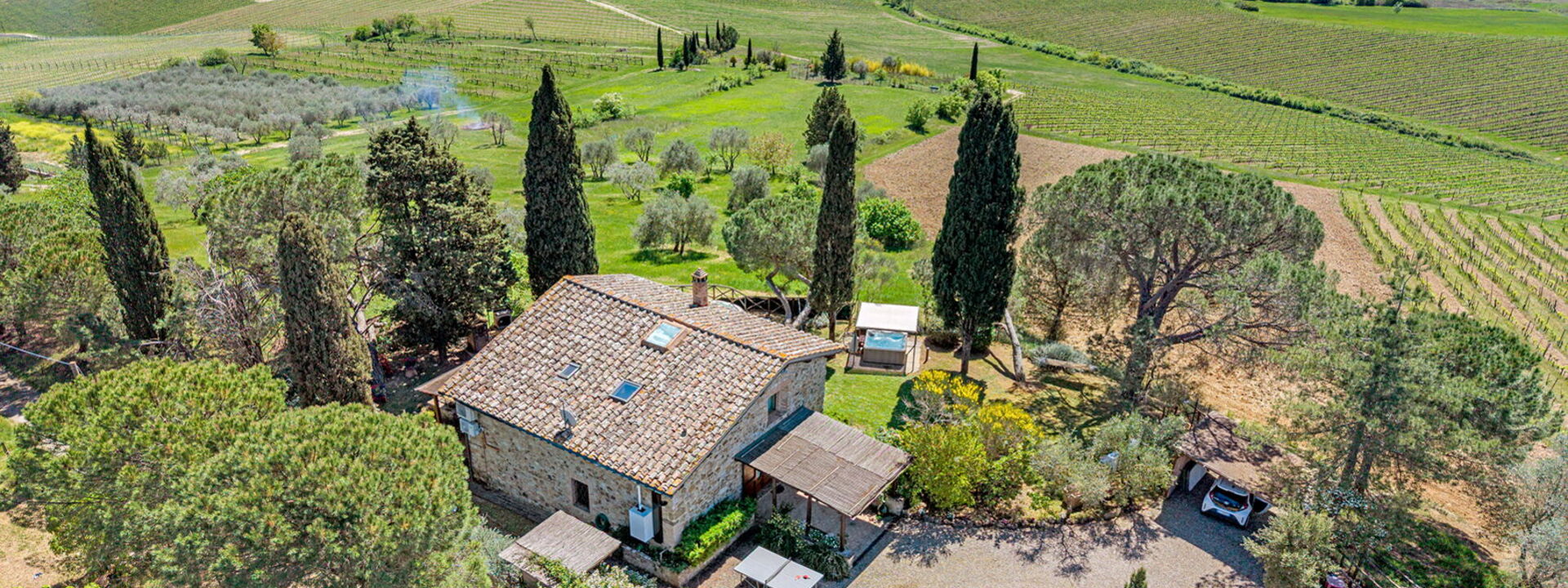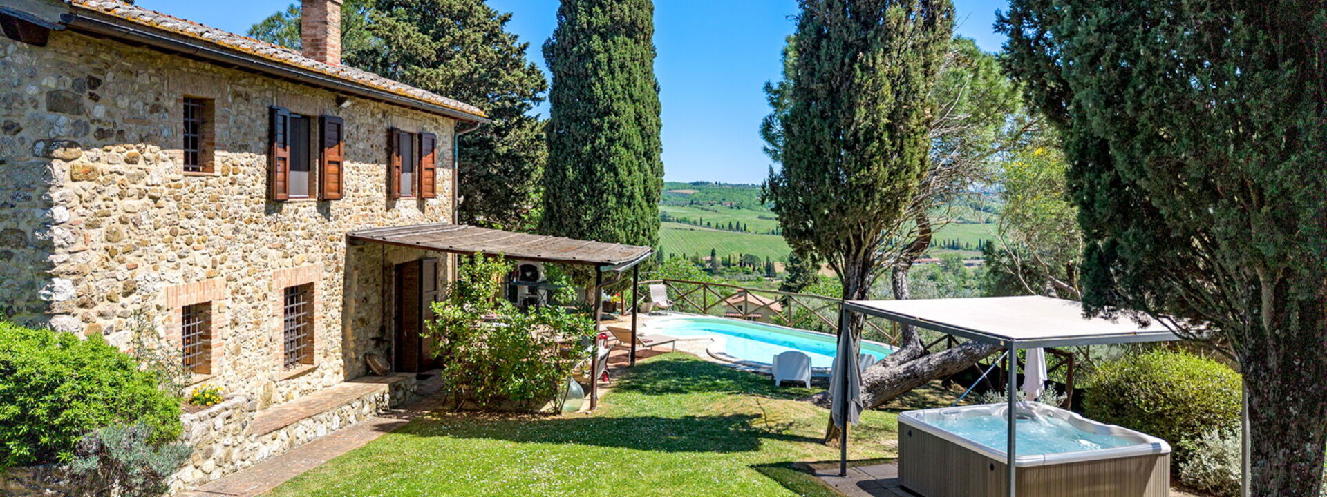 Le spesse mura in pietra della casa garantiscono un ambiente naturalmente fresco, mentre il moderno sistema di aria condizionata presente in tutta la villa assicura un comfort ottimale anche nei mesi più caldi. Al mattino presto, la valle sottostante si riempie spesso di una nebbia leggera che sale tra le colline: uno spettacolo di rara bellezza da ammirare direttamente dal giardino o dalle finestre della villa.