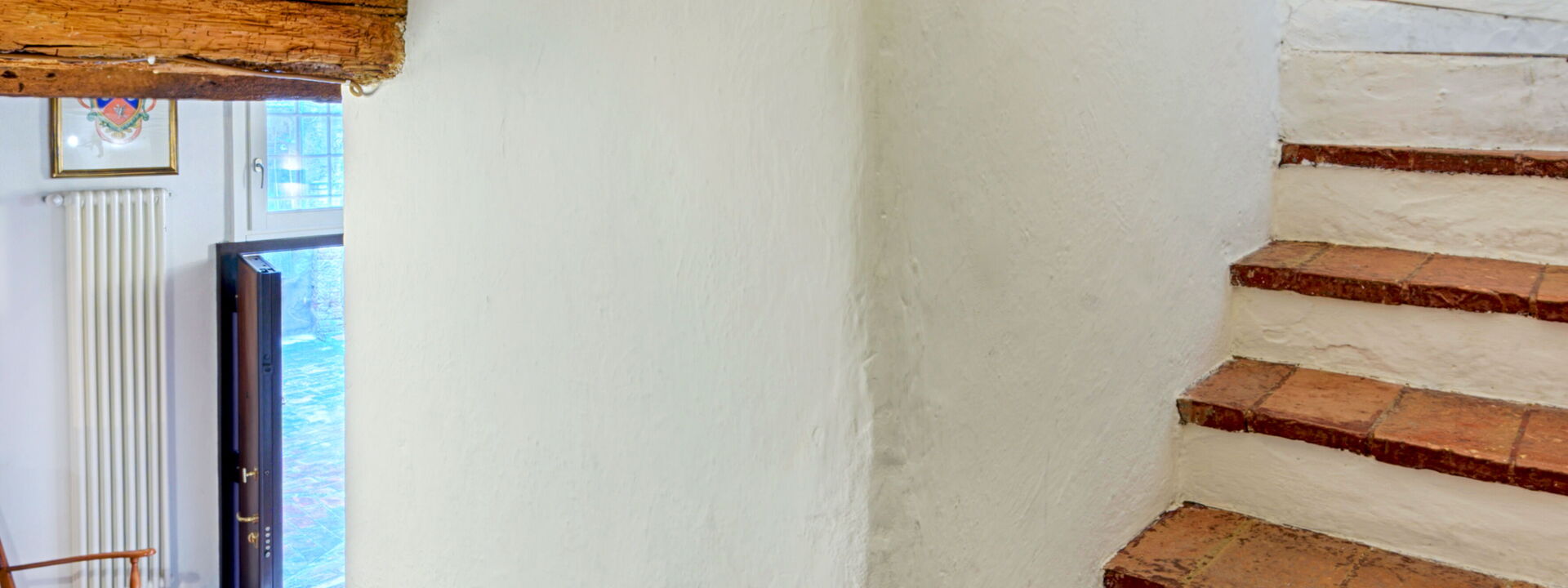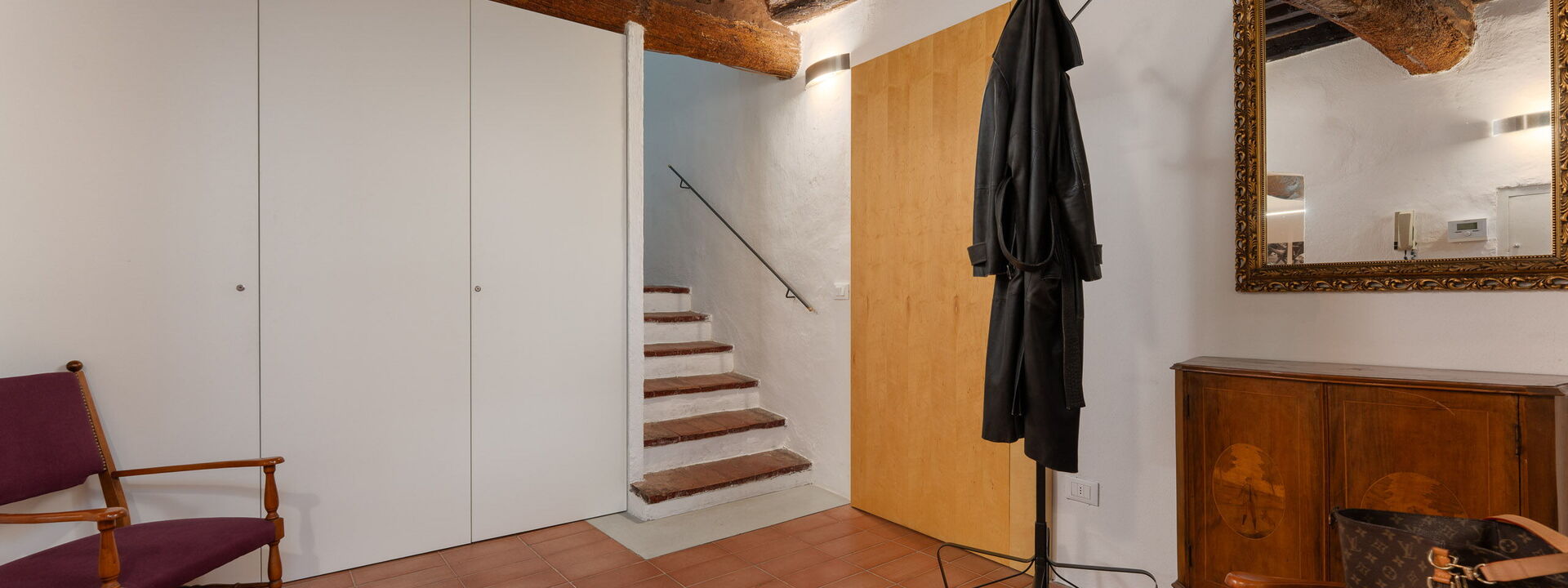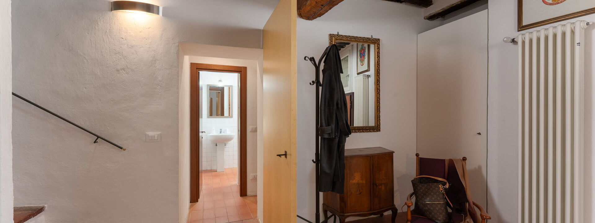 in modo accogliente e moderno ma con il fascino di grandi travi in legno del 600. A destra si entra nei due bagni uno con vasca/doccia ed uno con doccia e lavatrice. Al piano di sopra