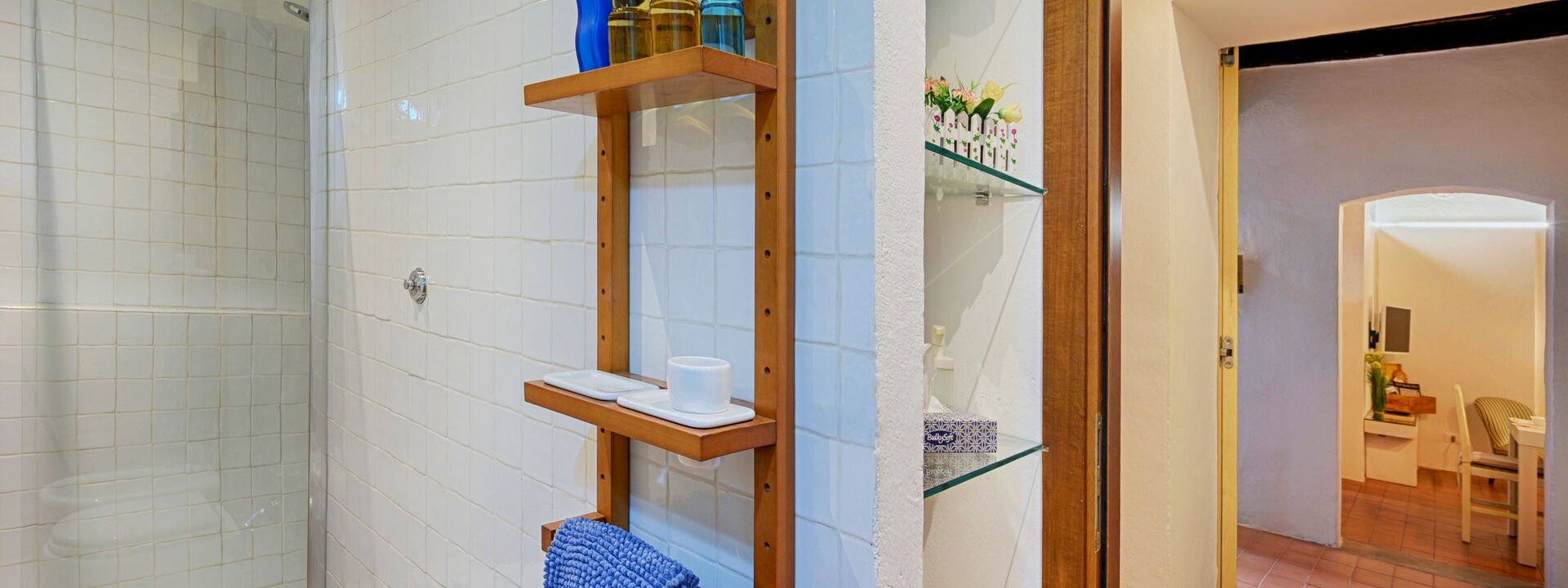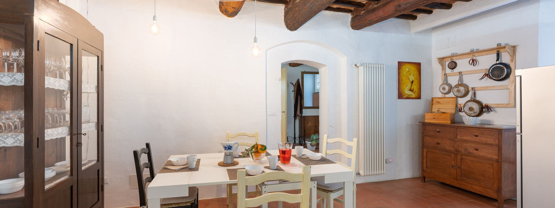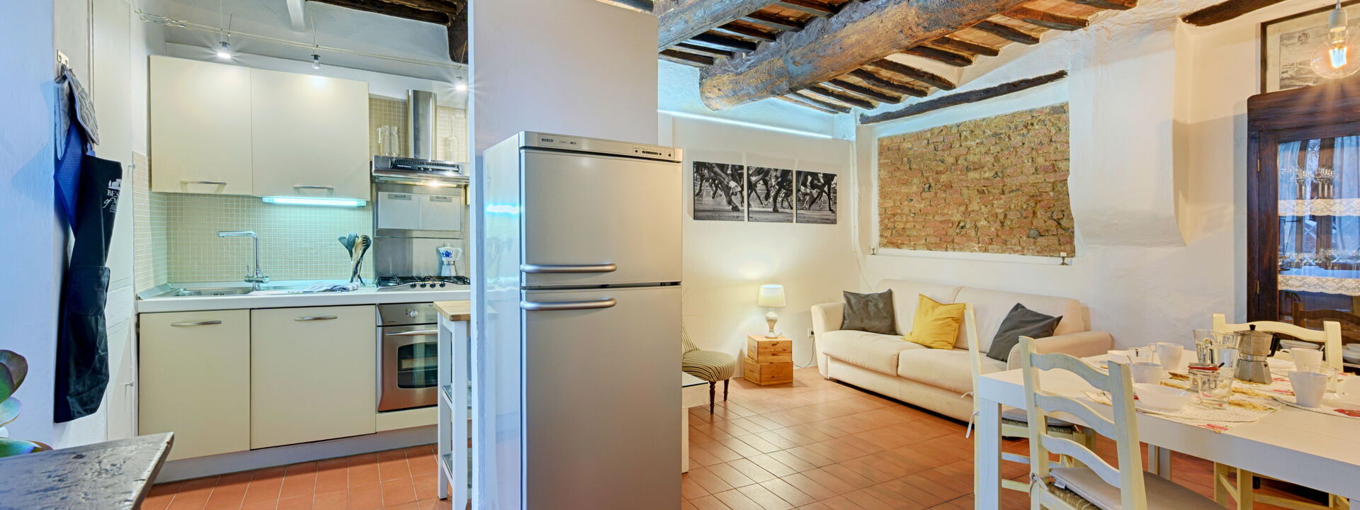 in modo accogliente e moderno ma con il fascino di grandi travi in legno del 600. A destra si entra nei due bagni uno con vasca/doccia ed uno con doccia e lavatrice. Al piano di sopra
