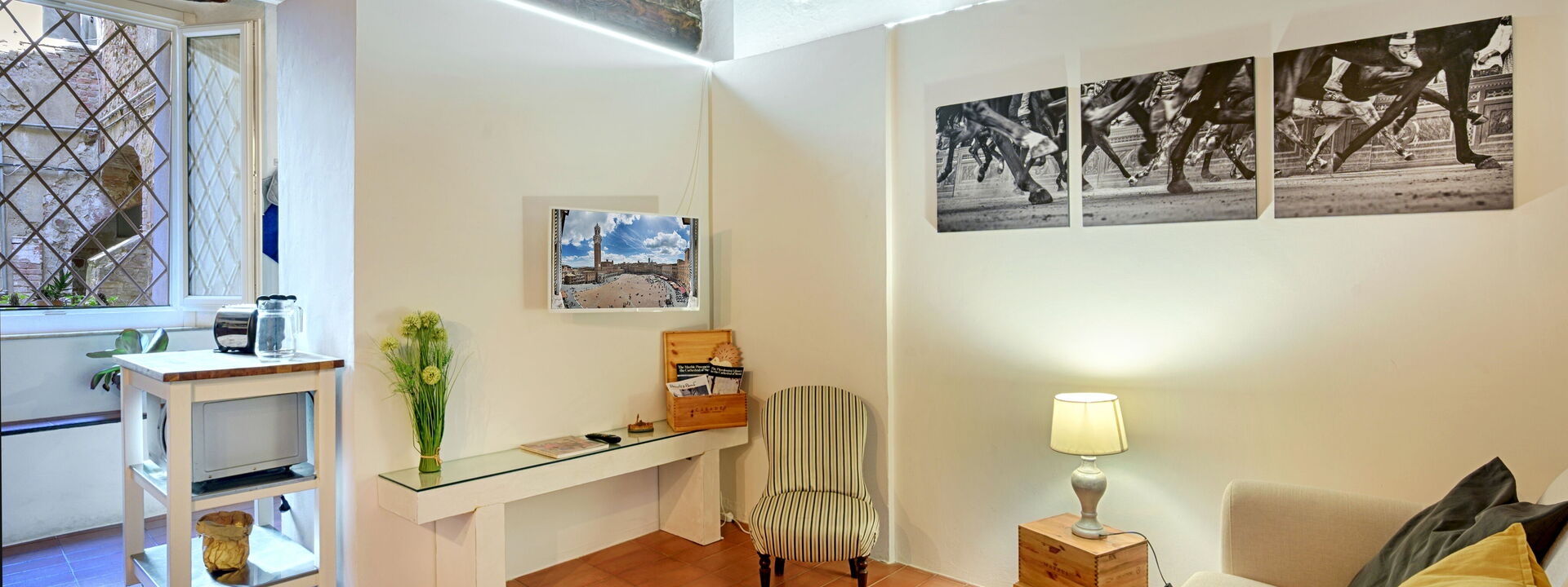 stazione ferroviaria ed a 5 min a piedi da Piazza del campo. Si accede da un portone che da su una loggia privata, quindi l'ingresso è totalmente indipendente e privato. Tutte le
