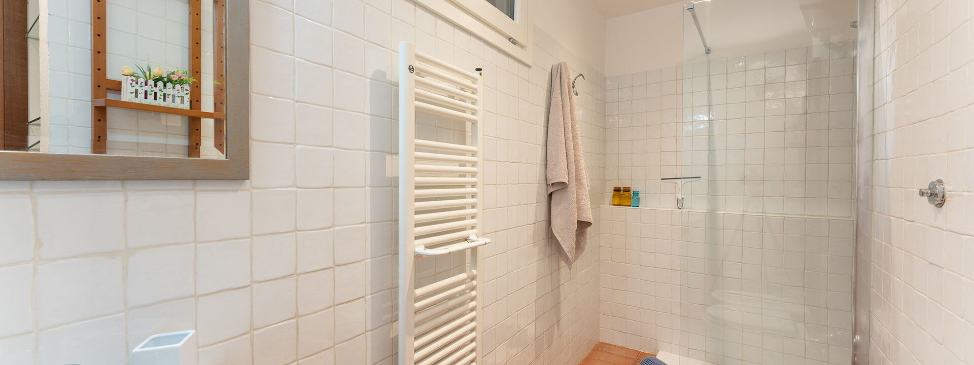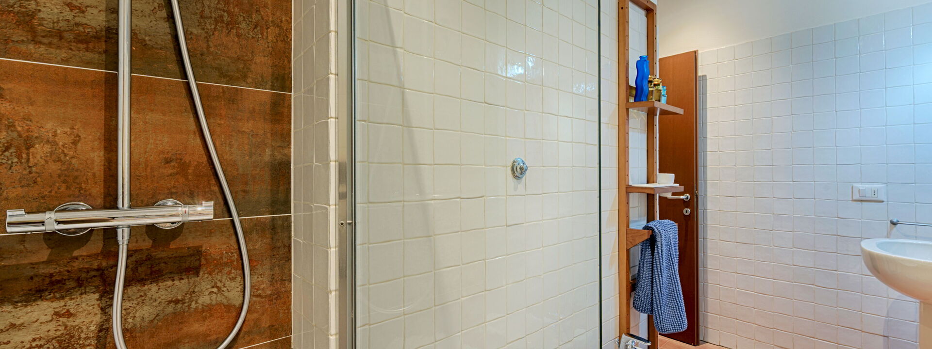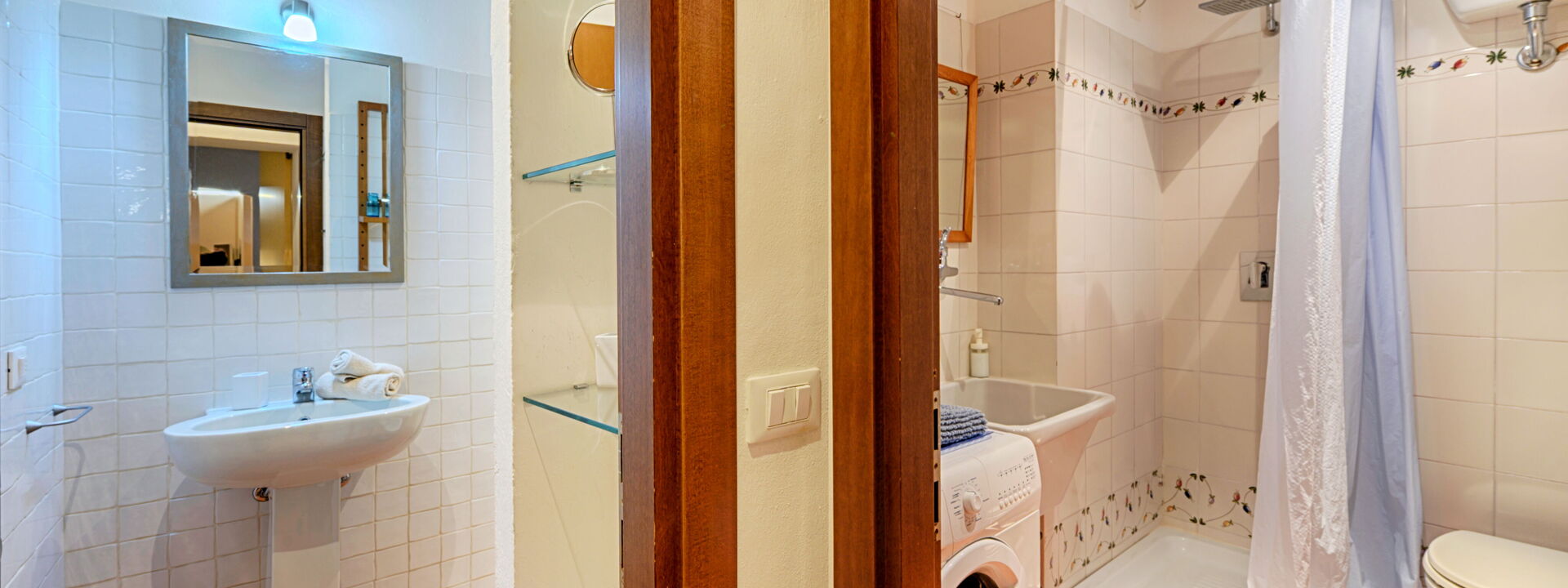 At the ground floor, just at the opposite side of the living room, 2 bathroom, each with shower and sink. In one of the bathroom you will find the washing machine.