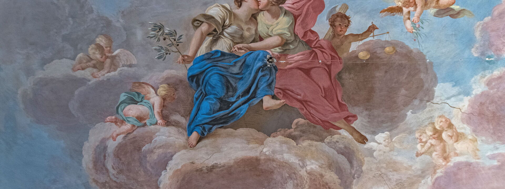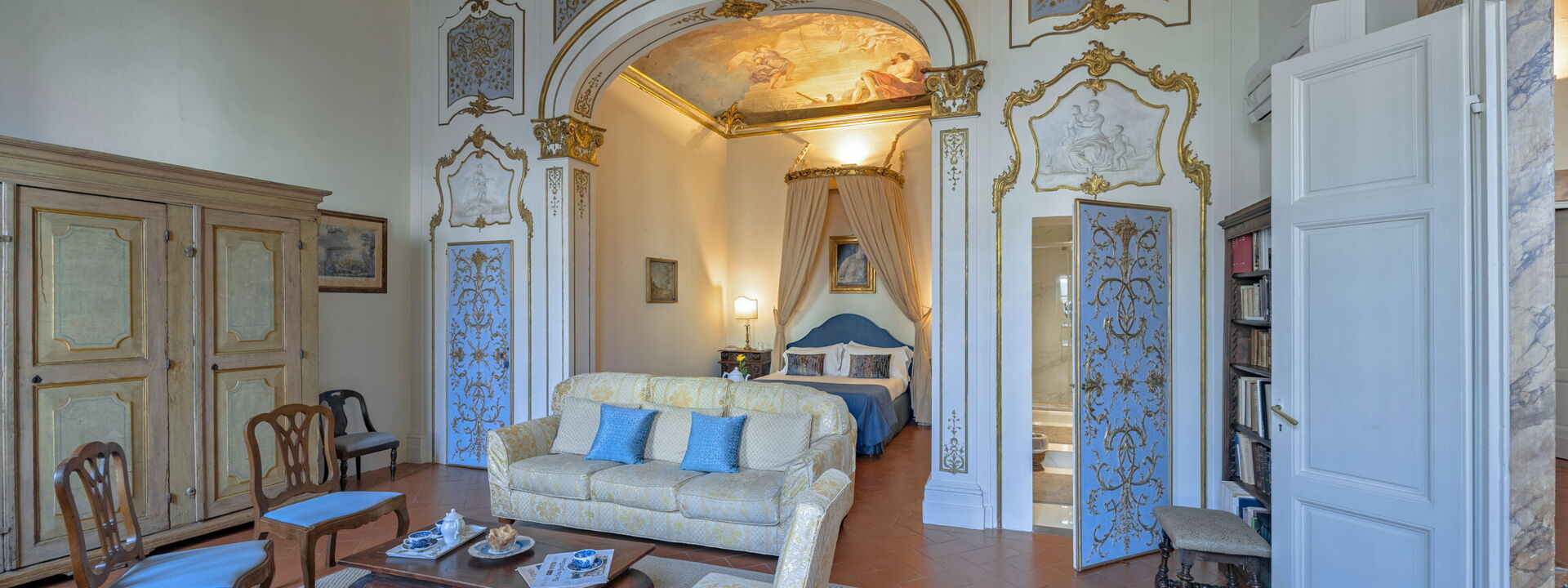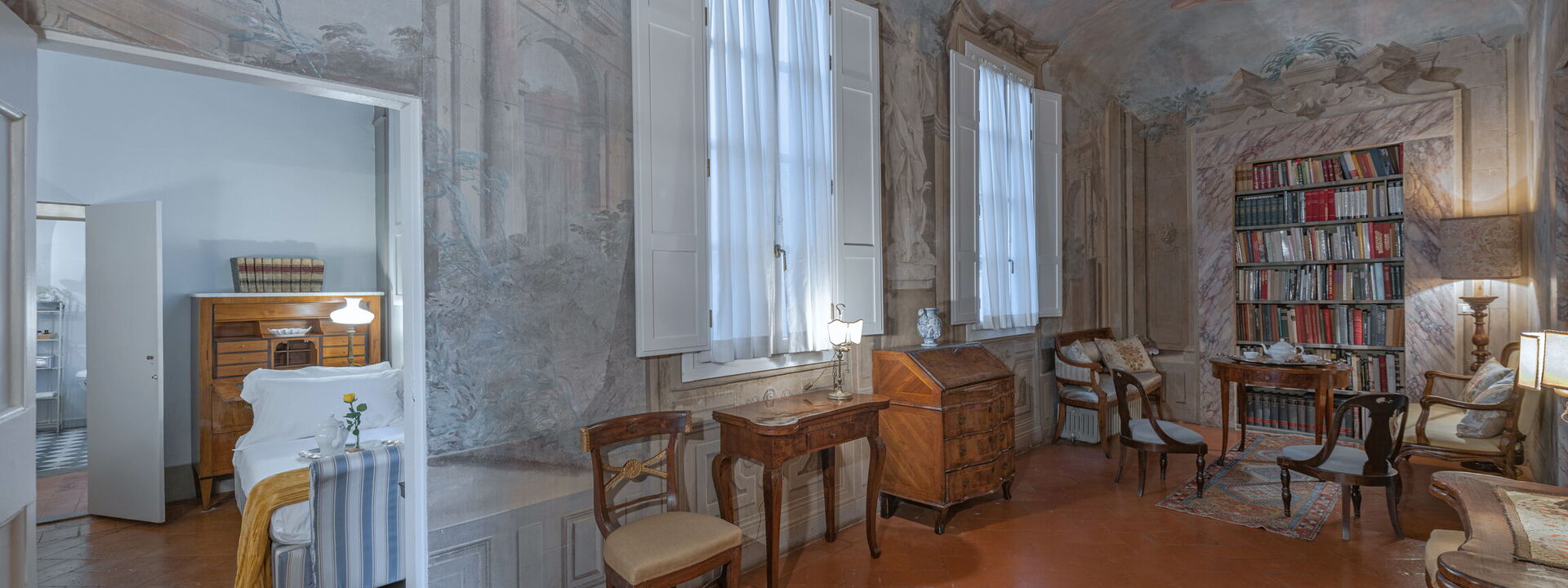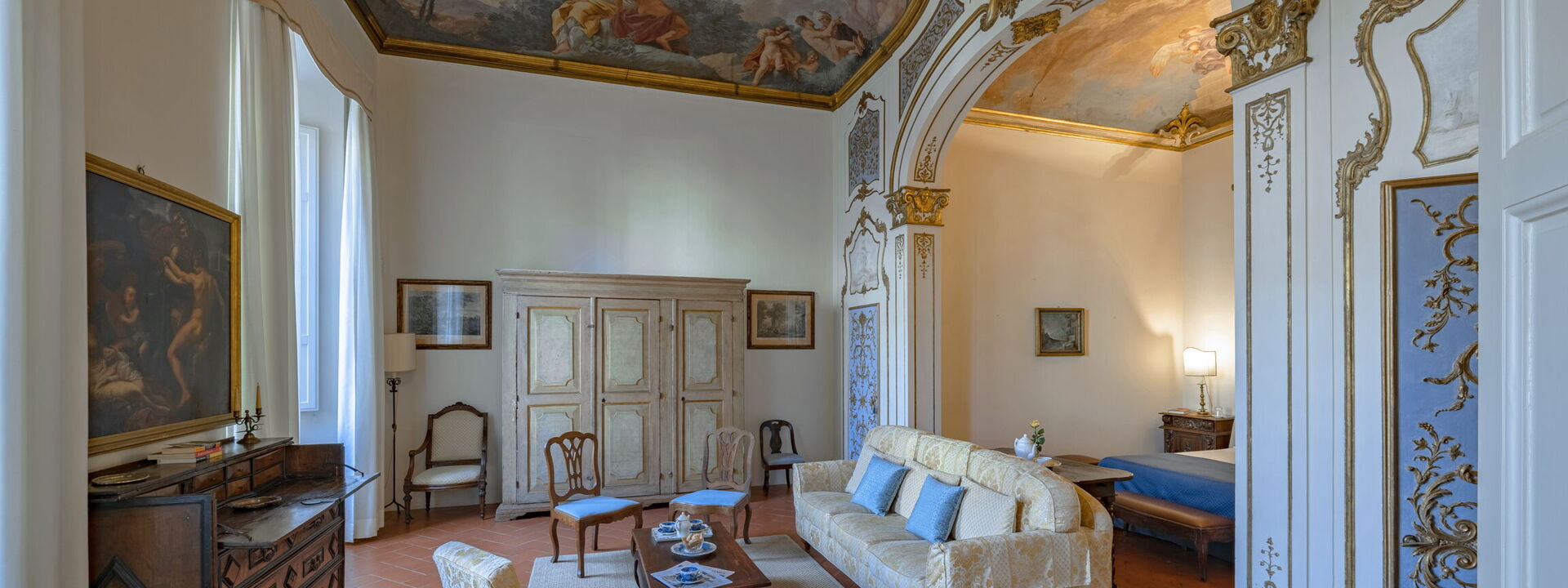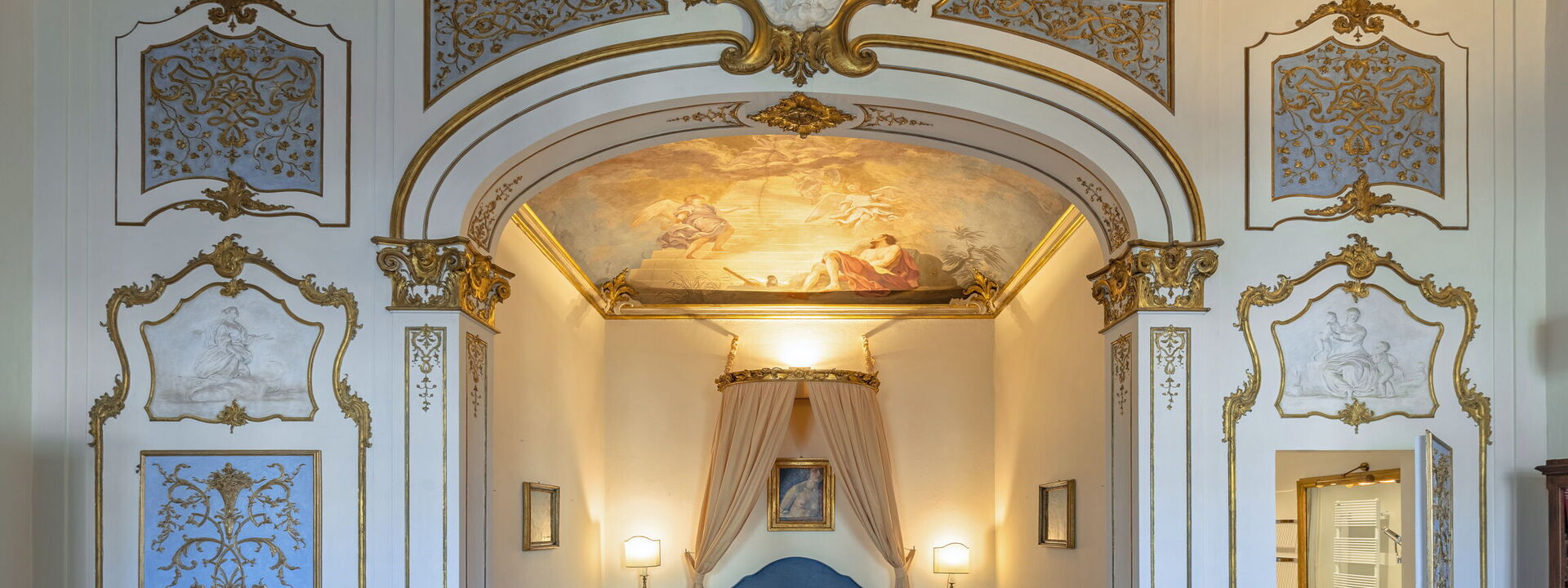 n the bedroom you can admire two frescoes of the school of Vincenzo Meucci: the "Allegory of Justice and Peace" in the antialcova and "The dream of Jacob" in the alcove, both painted by Tommaso Gherardini (1759).
