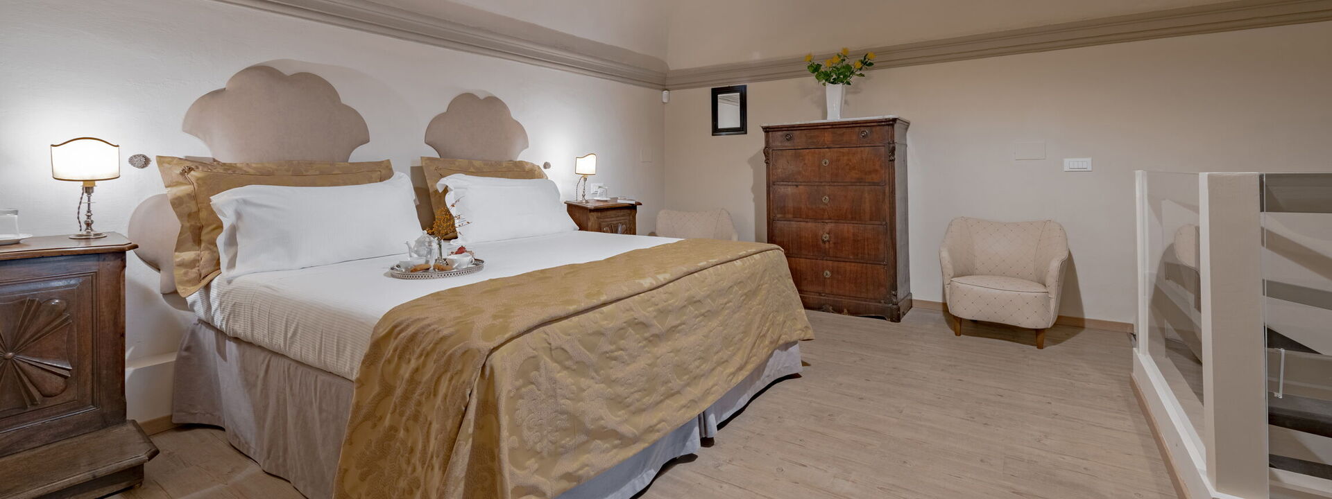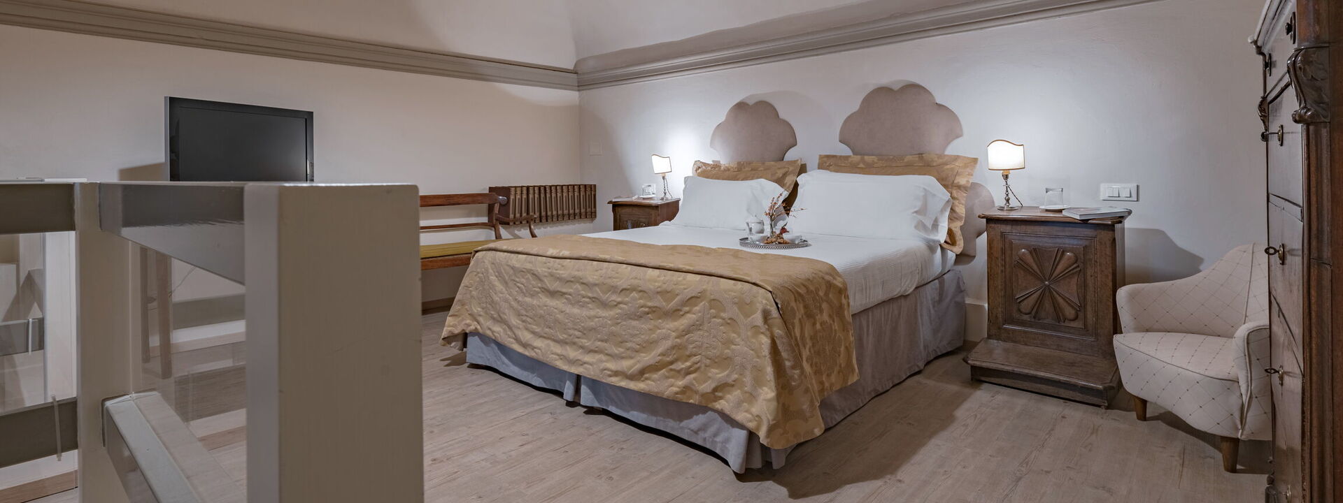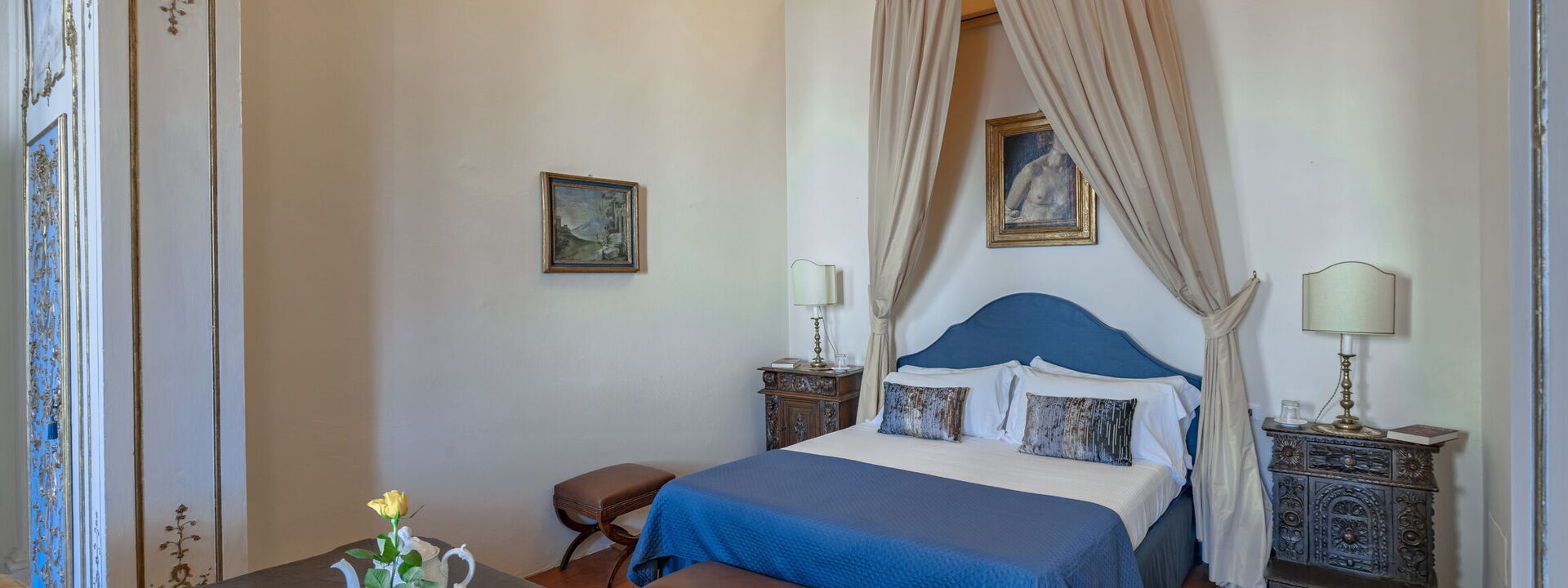 The alcove houses a large double bed surmounted by an ancient golden canopy. Two precious carved kneelers from the 600th century serve as bedside tables.