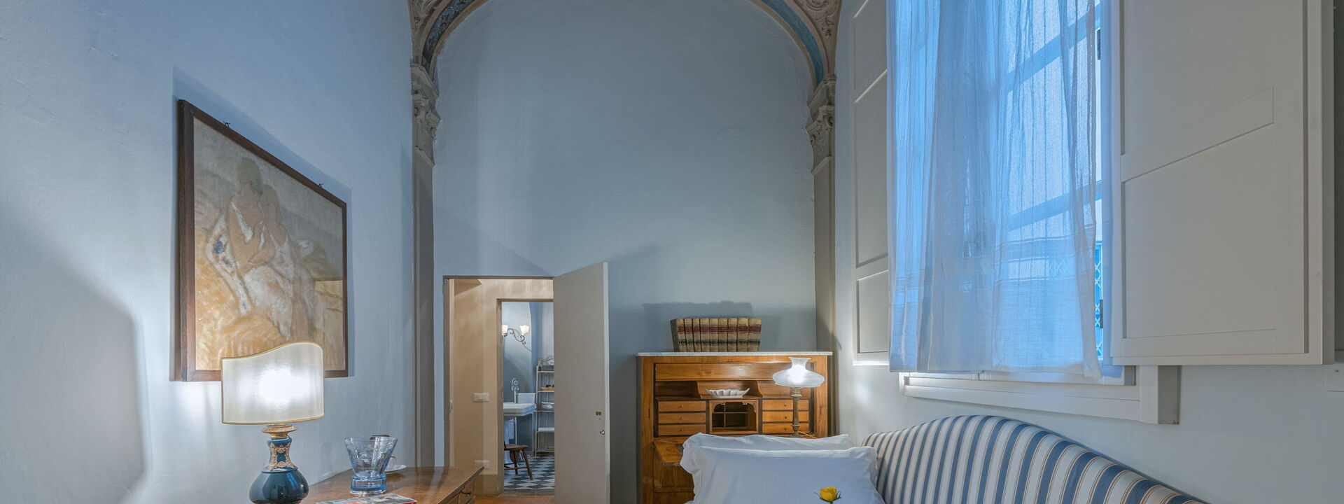 A third small bedroom / study embellished by a delightful vault frescoed with motifs of flowers and delicate lace, a second bathroom with tub where the original "bardiglio" floor of the time has been preserved and a comfortable wardrobe area with 2 large wardrobes.