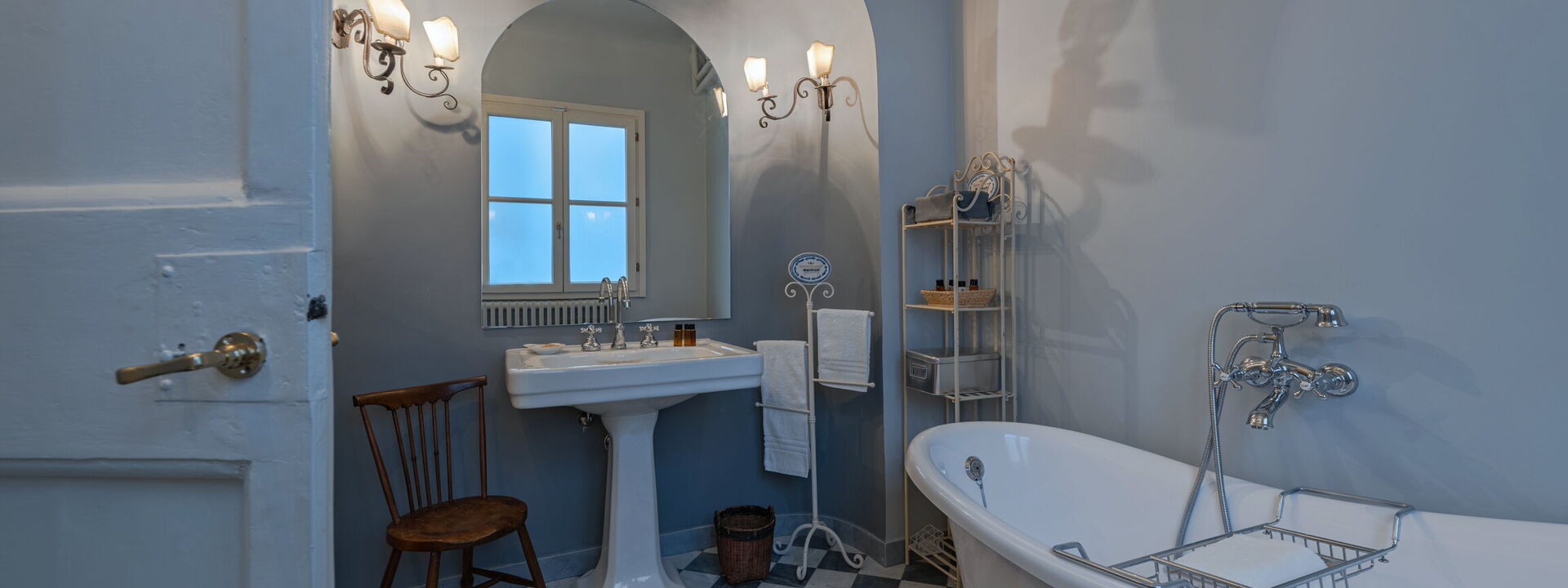 The en-suite bathroom has been entirely renovated during the recent restoration. The coverings are in Calacatta marble, the sanitary fixtures are of classic line in white porcelain.