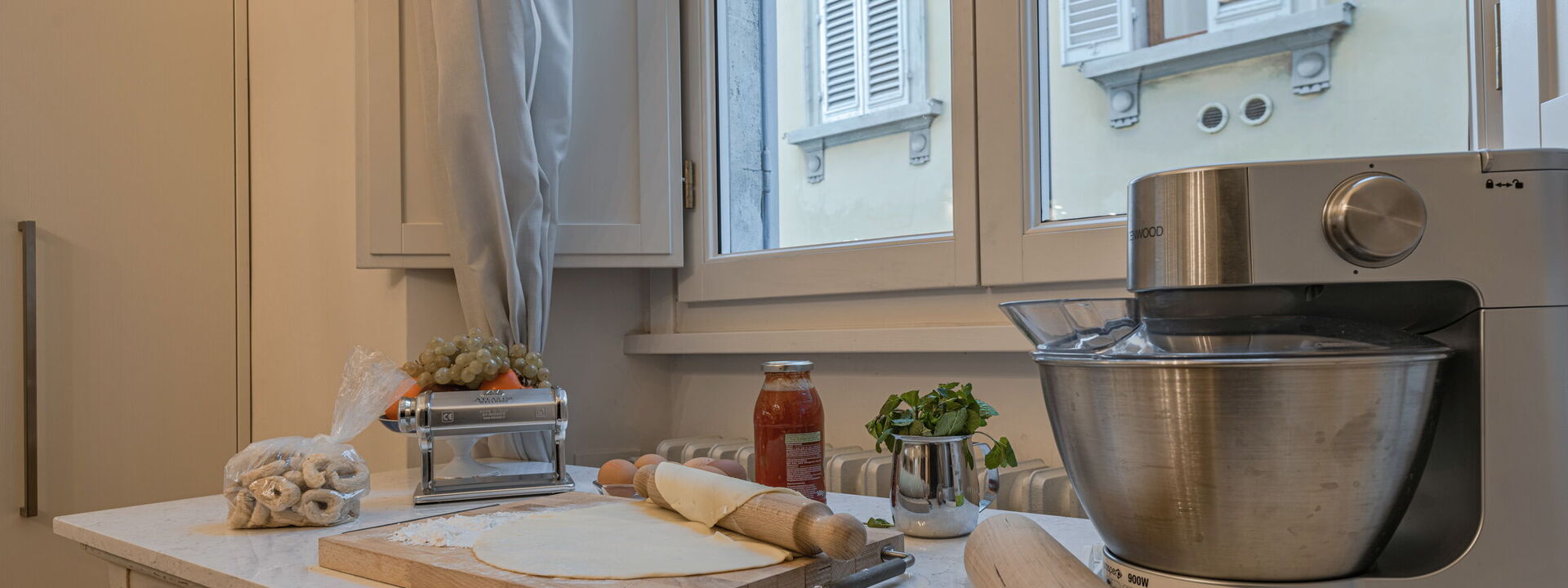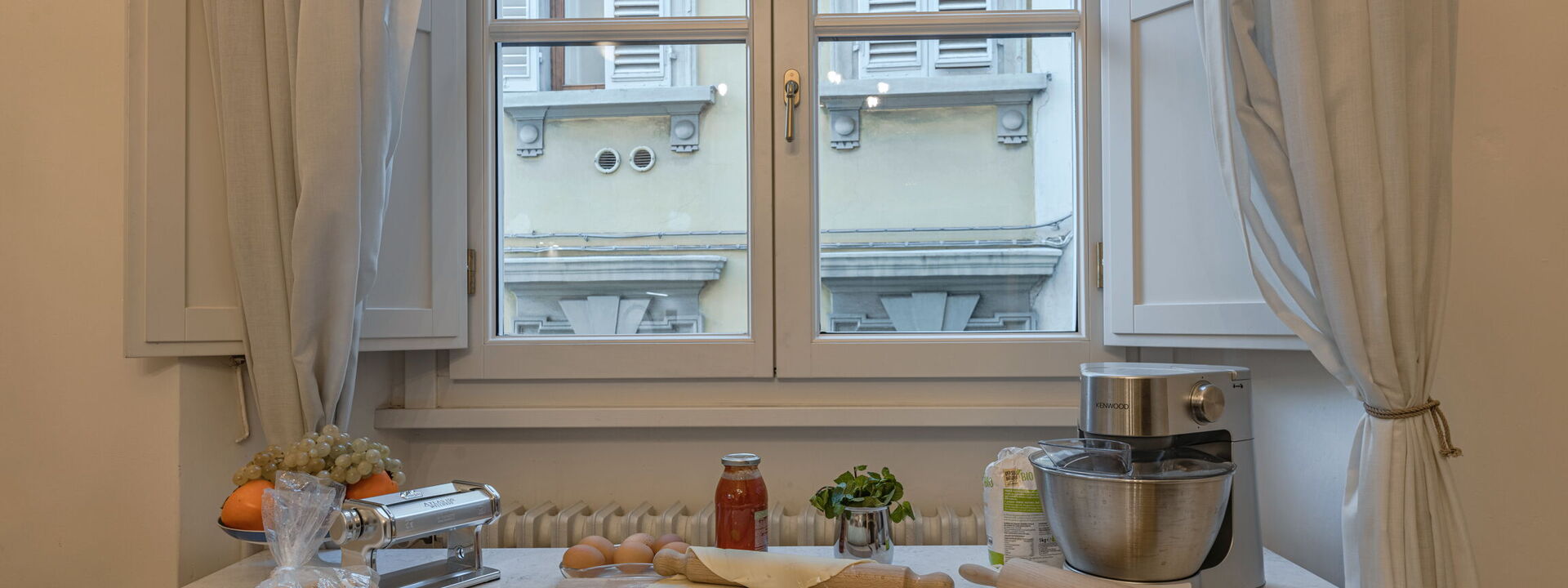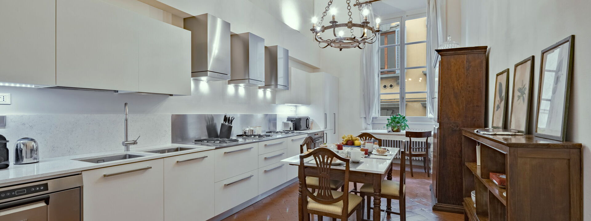 The living room with comfortable sofas, facing a large TV with Netflix, and beautiful antiques boasts an exquisite original 18th century frescoed soaring ceiling, depicting an allegory of music. Two bright windows facing the Cappelle Medicee let the natural light flood into the house. Completely frescoed library/tea room, perfect as a place to relax, unwind and enjoy one of the many art books available on the well-stocked bookshelves of the house. Traditional dining room hosts the most important frescoed ceiling of the Palazzo and it is marked with classic style. The warm wood antiques, several oil paintings of various periods, and the Murano hand-blown glass chandelier create an elegant space for formal dining. Two large windows let in plenty of natural light. The special characteristic of this house resides mostly in the details—from the delightful soaring frescoed ceilings and elaborate crown moldings, to the dark wood furnishings that add richness throughout the apartment. A fully equipped modern A/C eat-in kitchen and a laundry room complete this floor.