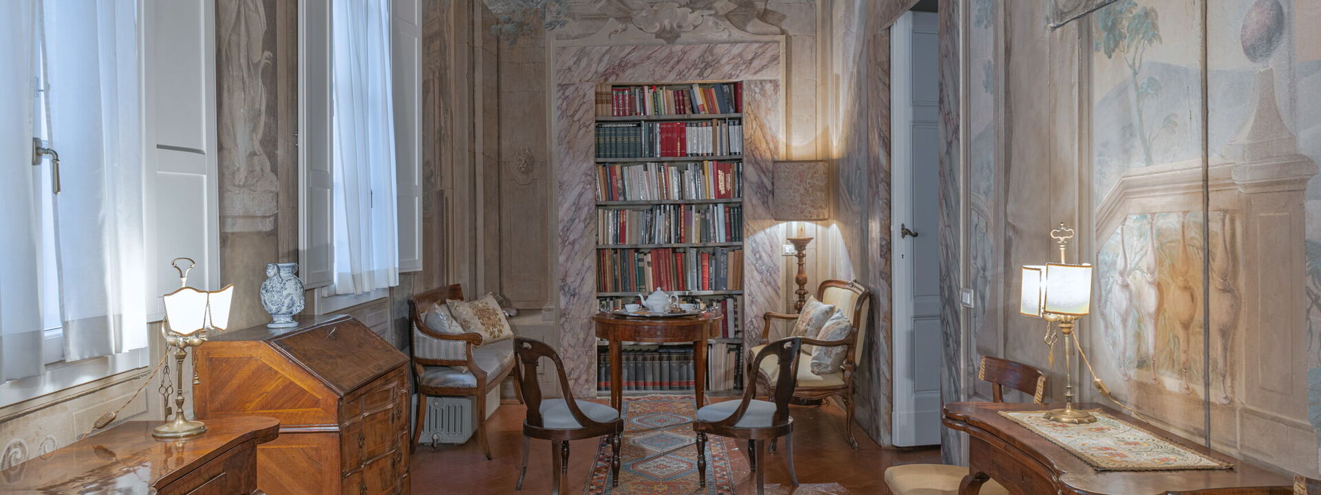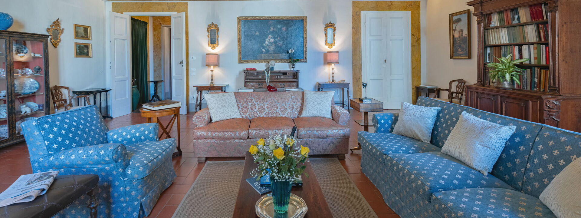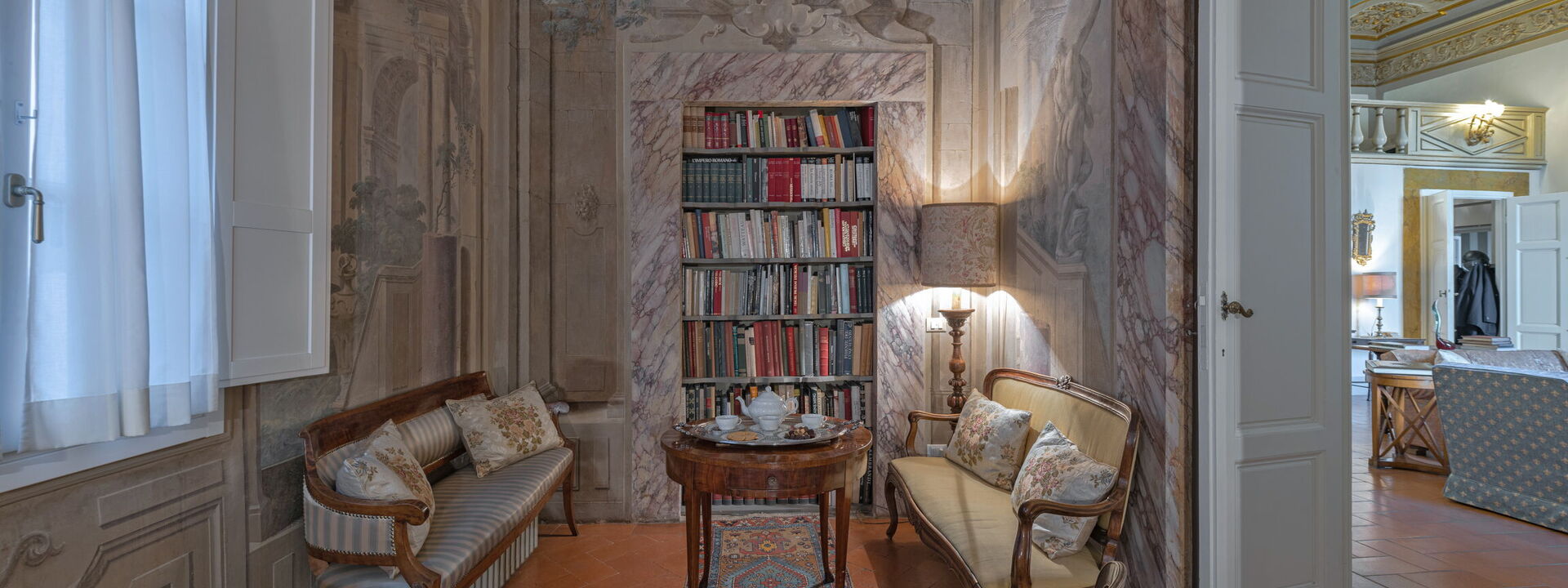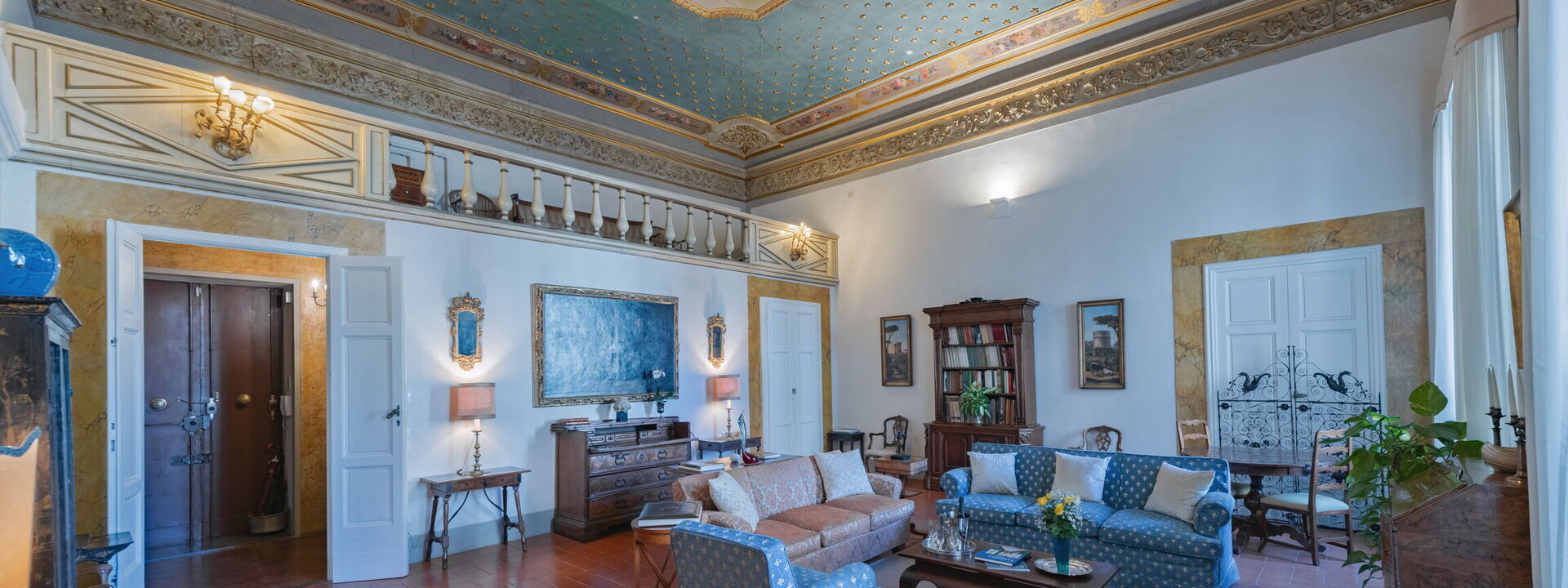 A delightful gallery, entirely frescoed by Tommaso Gherardini and Lorenzo del Moro, with the typical ppearance of the winter garden, connects the living room to the rest of the house