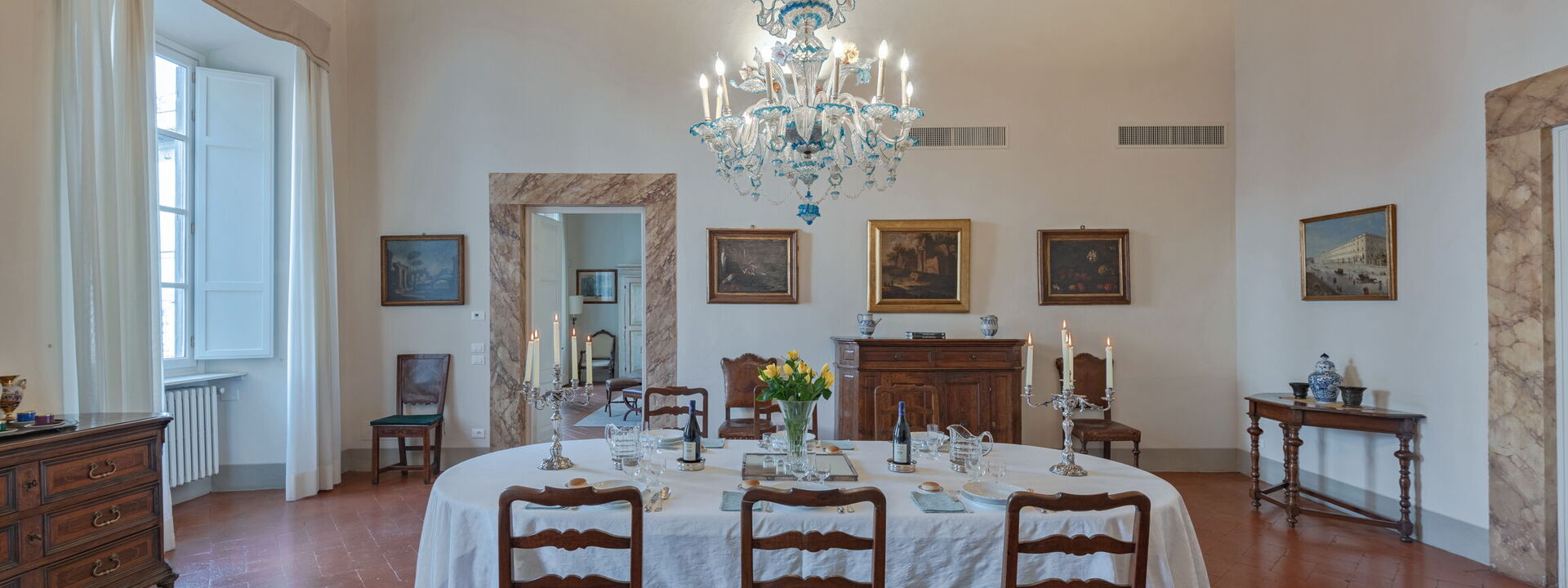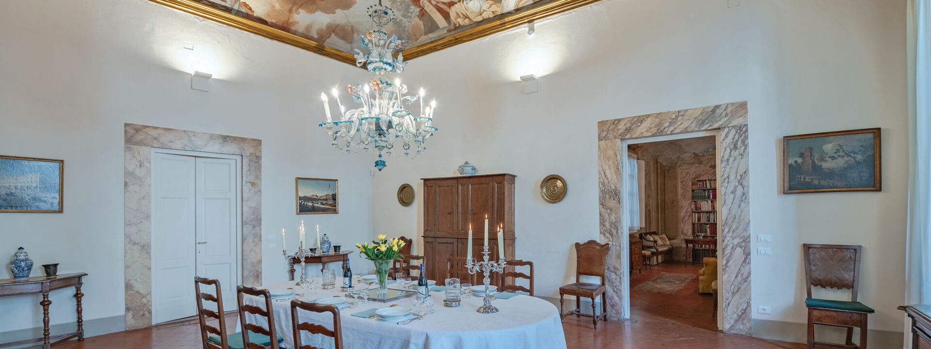 A 50 square meters dining room, furnished with a large central table and a sideboard, both of the '600, 2 round tables for small breakfasts or dinners: here you can admire the most important fresco of the Palazzo, "The Allegory of Arts and Virtues that defeat the Vices" by Vincenzo Meucci (1759).