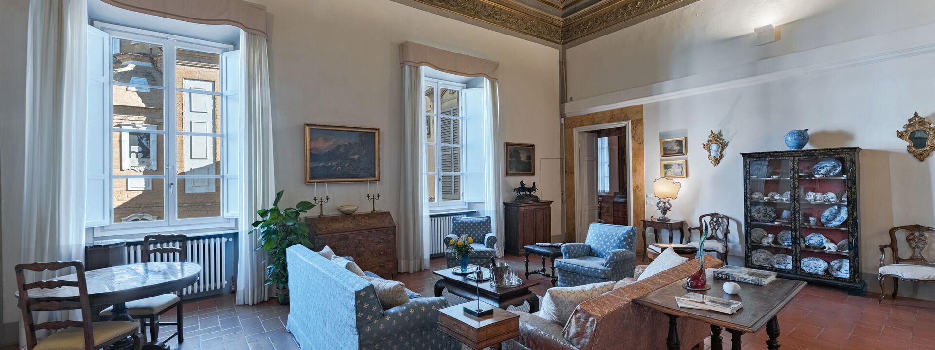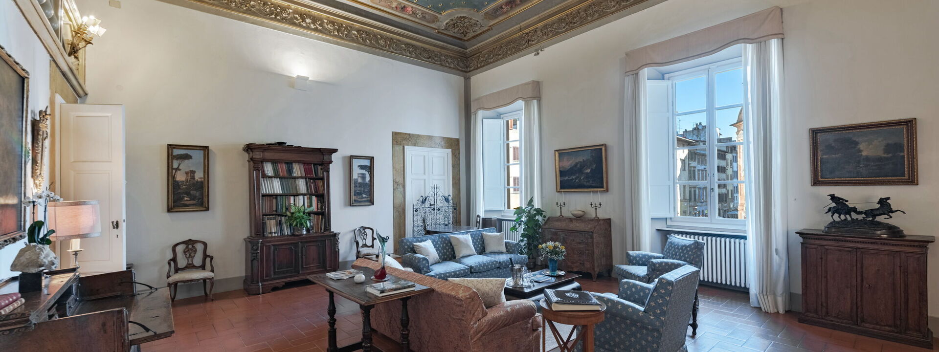 This unique apartment is located on the second floor, or “piano nobile,” of a landmarked Florentine palazzo set in an outstanding location inside the historical city center. The apartment, meticulously maintained with every detail restored to perfection, faces the famous Cappelle Medicee, which dates back to the 16th and 17th centuries. When you step outside the door, you find yourself strolling in the city’s oldest neighborhood, and the Santa Maria Novella Rail station is only 5 minutes away by foot. The location is within walking distance to shopping, world famous museums and galleries, and the city’s finest outdoor monuments, besides plenty of restaurants and cafés with ample sidewalk seating perfect for soaking up the atmosphere. The history and integrity of this historic home remain intact, enhanced by modern amenities.